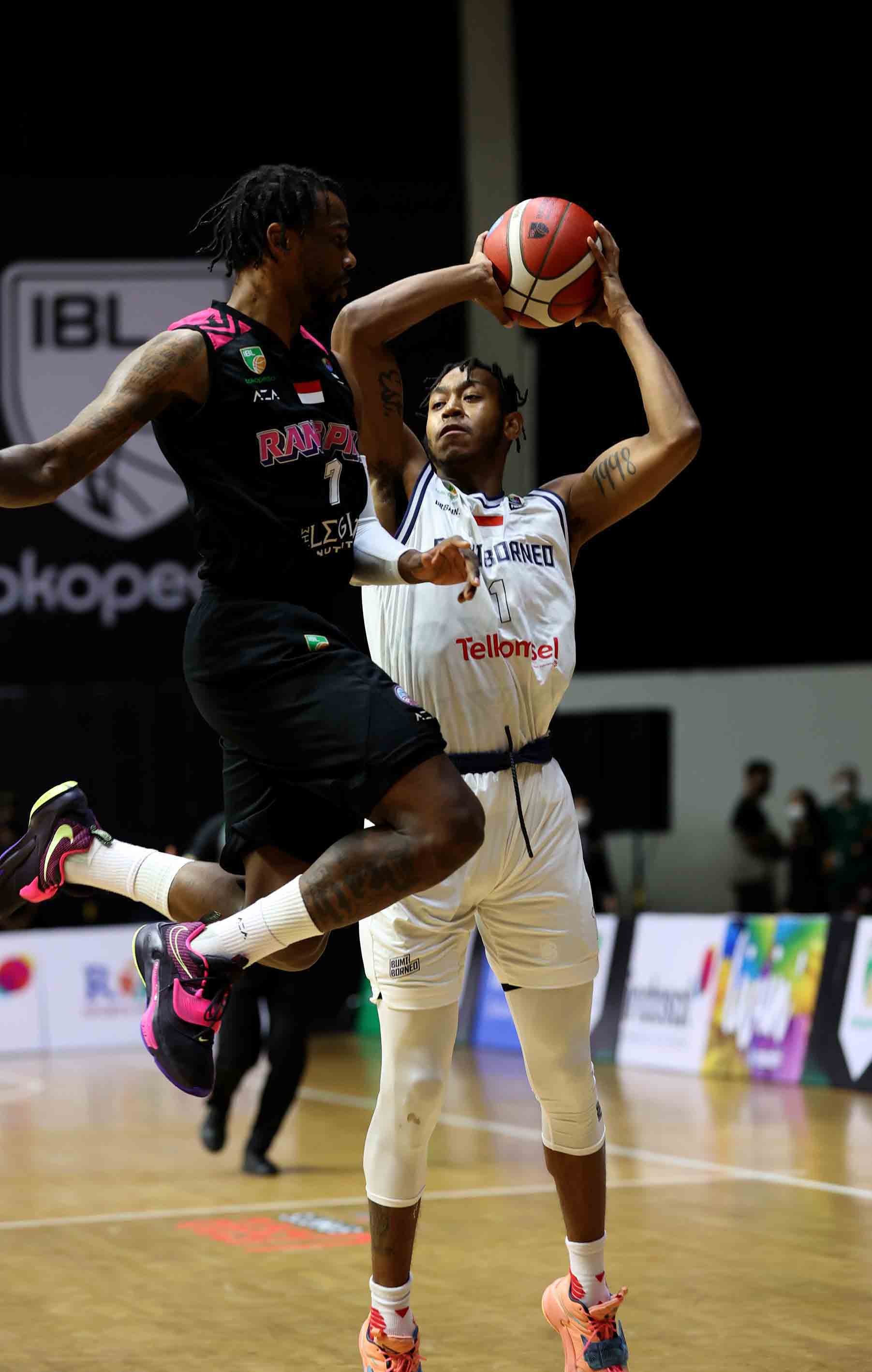 Randy Bell (1) pemain Bumi Borneo Basketball Pontianak mendapat kawalan dari pemain RANS PIK Basketball Club, Jalil Austin Mohammed Abdul Bassit (7). Bumi Borneo Basketball Pontianak melawan RANS PIK Basketball Club pada pertandingan Seri 1 Jakarta Indonesian Basketball League (IBL) 2022 di Hall Basket GBK, Jakarta, Jum’at (21/1/2022). Bumi Borneo Basketball Pontianak kalah oleh RANS PIK Basketball Club dengan skor 65-70. (Photo : Bobby Arifin)