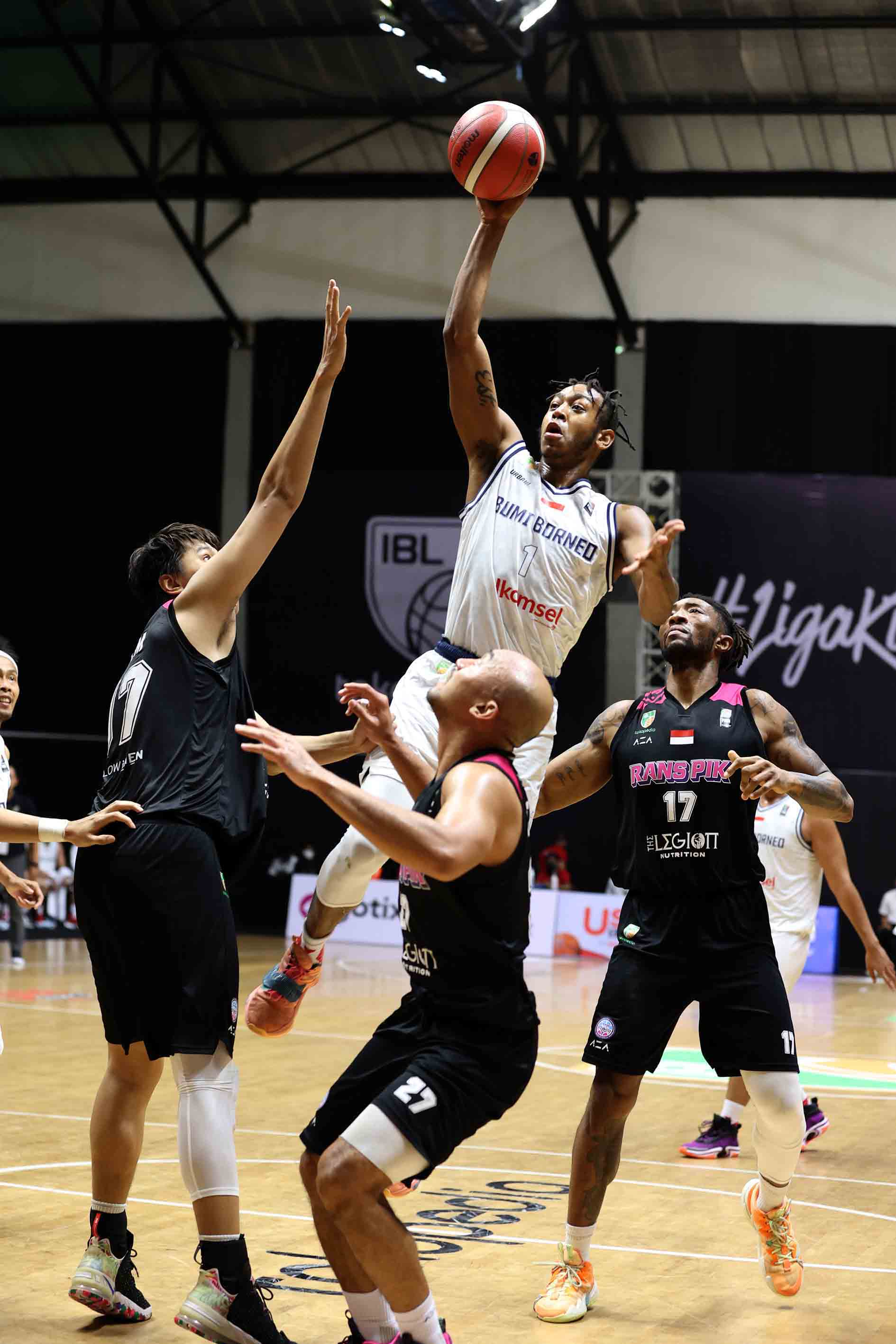 Randy Bell (1) pemain Bumi Borneo Basketball Pontianak melempar bola ke arah ring RANS PIK Basketball Club. Bumi Borneo Basketball Pontianak melawan RANS PIK Basketball Club pada pertandingan Seri 1 Jakarta Indonesian Basketball League (IBL) 2022 di Hall Basket GBK, Jakarta, Jum’at (21/1/2022). Bumi Borneo Basketball Pontianak kalah oleh RANS PIK Basketball Club dengan skor 65-70. (Photo : Bobby Arifin)