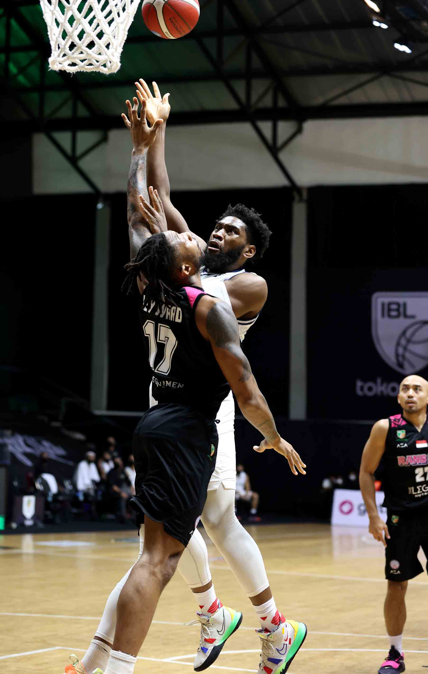 Austin Mofunanya (0) pemain Bumi Borneo Basketball Pontianak mendapat kawalan dari pemain RANS PIK Basketball Club, Hal Shane Heyward (17). Bumi Borneo Basketball Pontianak melawan RANS PIK Basketball Club pada pertandingan Seri 1 Jakarta Indonesian Basketball League (IBL) 2022 di Hall Basket GBK, Jakarta, Jum’at (21/1/2022). Bumi Borneo Basketball Pontianak kalah oleh RANS PIK Basketball Club dengan skor 65-70. (Photo : Bobby Arifin)