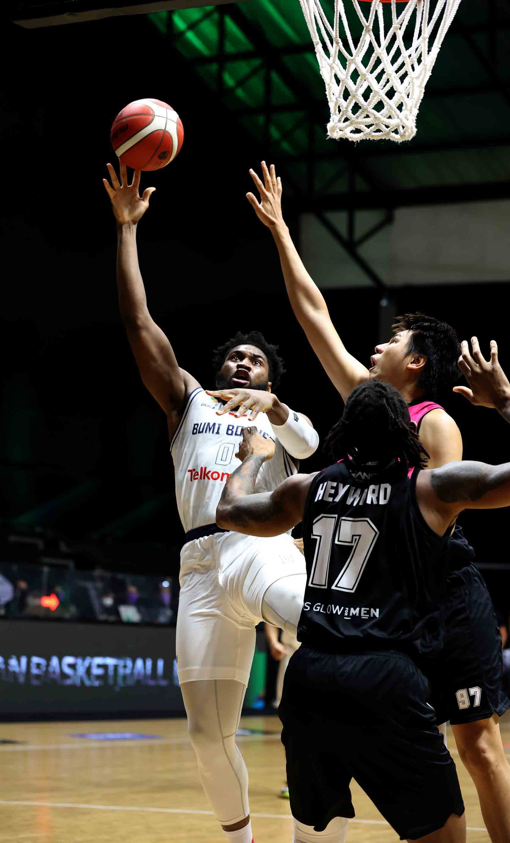 Austin Mofunanya (0) pemain Bumi Borneo Basketball Pontianak mendapat kawalan dari para pemain RANS PIK Basketball Club. Bumi Borneo Basketball Pontianak melawan RANS PIK Basketball Club pada pertandingan Seri 1 Jakarta Indonesian Basketball League (IBL) 2022 di Hall Basket GBK, Jakarta, Jum’at (21/1/2022). Bumi Borneo Basketball Pontianak kalah oleh RANS PIK Basketball Club dengan skor 65-70. (Photo : Bobby Arifin)