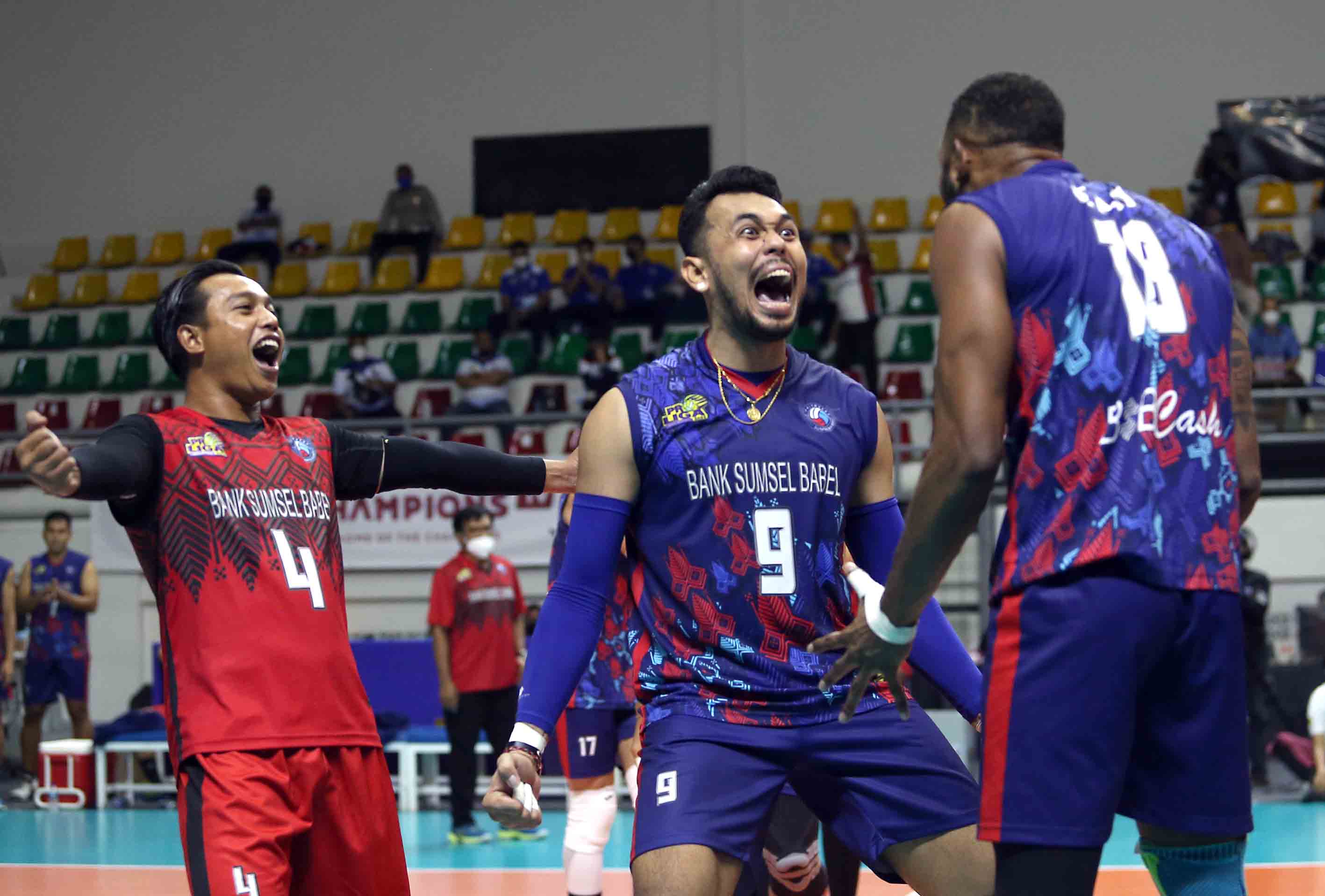 I Putu Randu Wahyu Pradana Putra (9) pemain Bank Sumsel Babel meluapkan emosi kepada rekan timnnya.