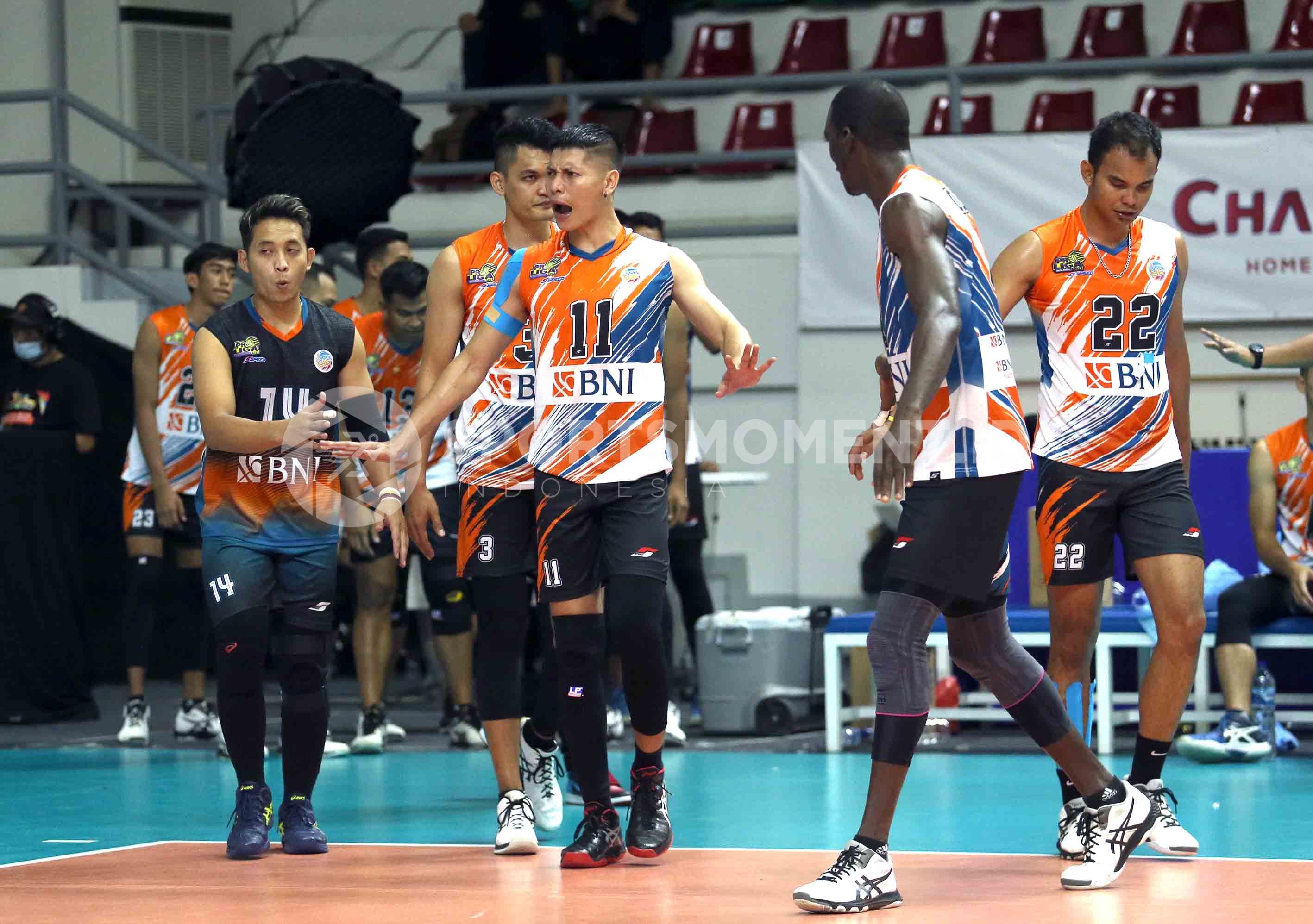 Tim bola voli putra Jakarta BNI membuktikan diri layak melaju ke babak final four Proliga 2022 seusai mengalahkan tim pendatang baru Kudus Sukun Badak. Berlaga di di GOR Kawah Candradimuka Padepokan Voli Jenderal Polisi Kunarto, Sentul, Jumat (4/3), Jakarta BNI 46 menang dengan skor 3-1 (25-20, 25-23, 24-26, 25-17) atas Kudus Sukun Badak. (Foto: Erly Bahtiar/sportsmoment.id)