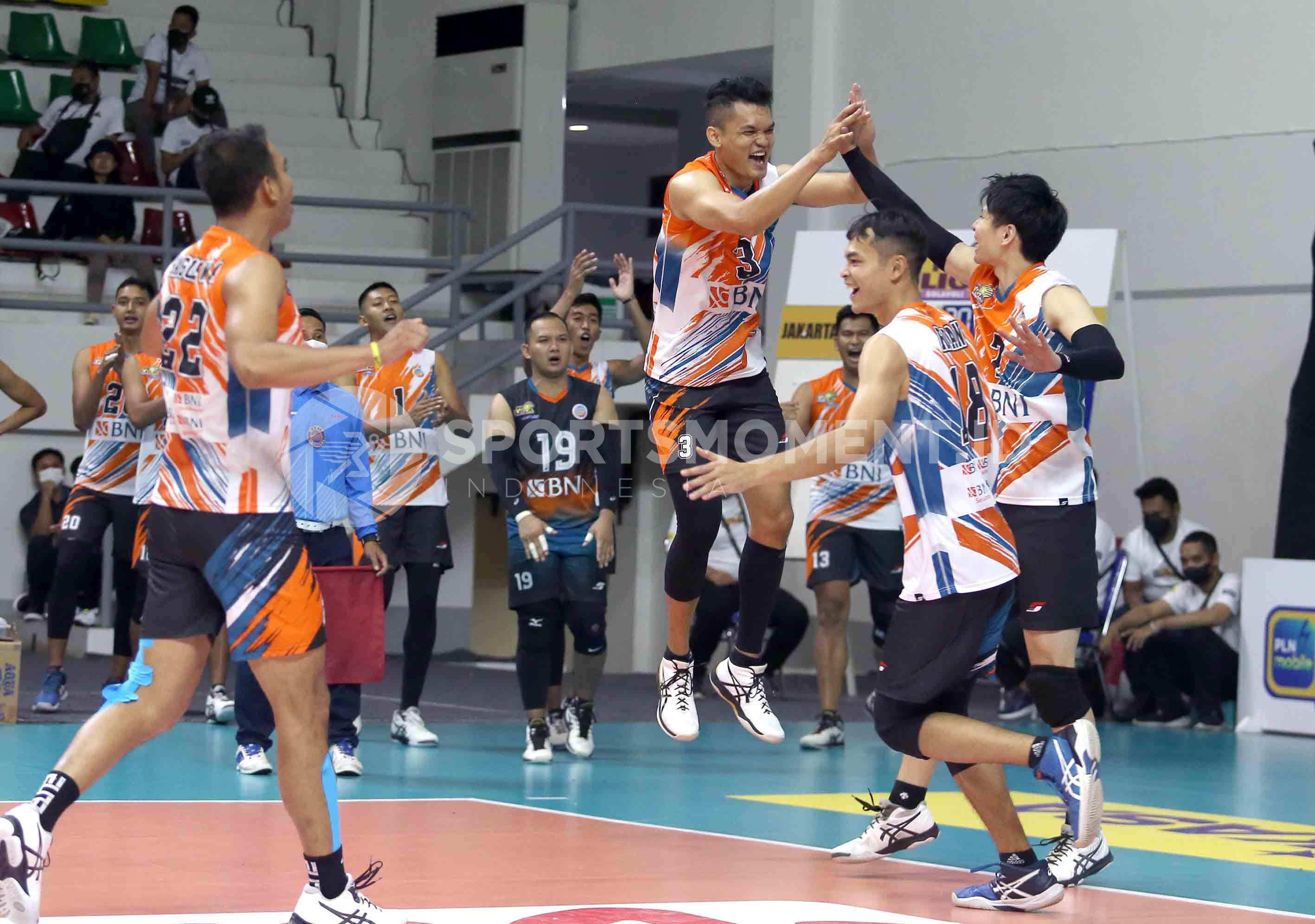 Tim bola voli putra Jakarta BNI membuktikan diri layak melaju ke babak final four Proliga 2022 seusai mengalahkan tim pendatang baru Kudus Sukun Badak. Berlaga di di GOR Kawah Candradimuka Padepokan Voli Jenderal Polisi Kunarto, Sentul, Jumat (4/3), Jakarta BNI 46 menang dengan skor 3-1 (25-20, 25-23, 24-26, 25-17) atas Kudus Sukun Badak. (Foto: Erly Bahtiar/sportsmoment.id)
