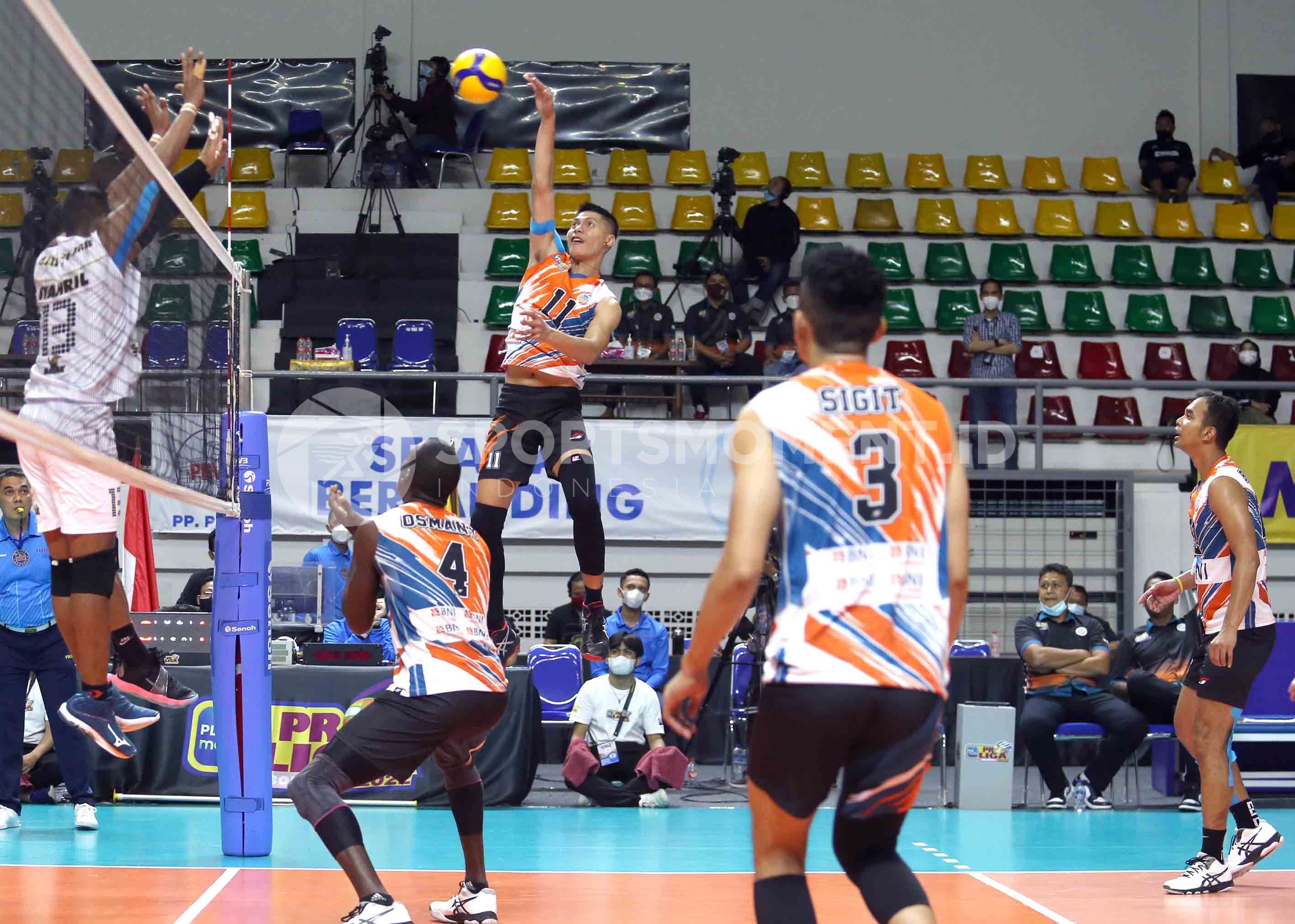 Dimas Saputra (11) melancarkan smash ke Kudus Sukun Badak. Tim bola voli putra Jakarta BNI membuktikan diri layak melaju ke babak final four Proliga 2022 seusai mengalahkan tim pendatang baru Kudus Sukun Badak. Berlaga di di GOR Kawah Candradimuka Padepokan Voli Jenderal Polisi Kunarto, Sentul, Jumat (4/3), Jakarta BNI 46 menang dengan skor 3-1 (25-20, 25-23, 24-26, 25-17) atas Kudus Sukun Badak. (Foto: Erly Bahtiar/sportsmoment.id)