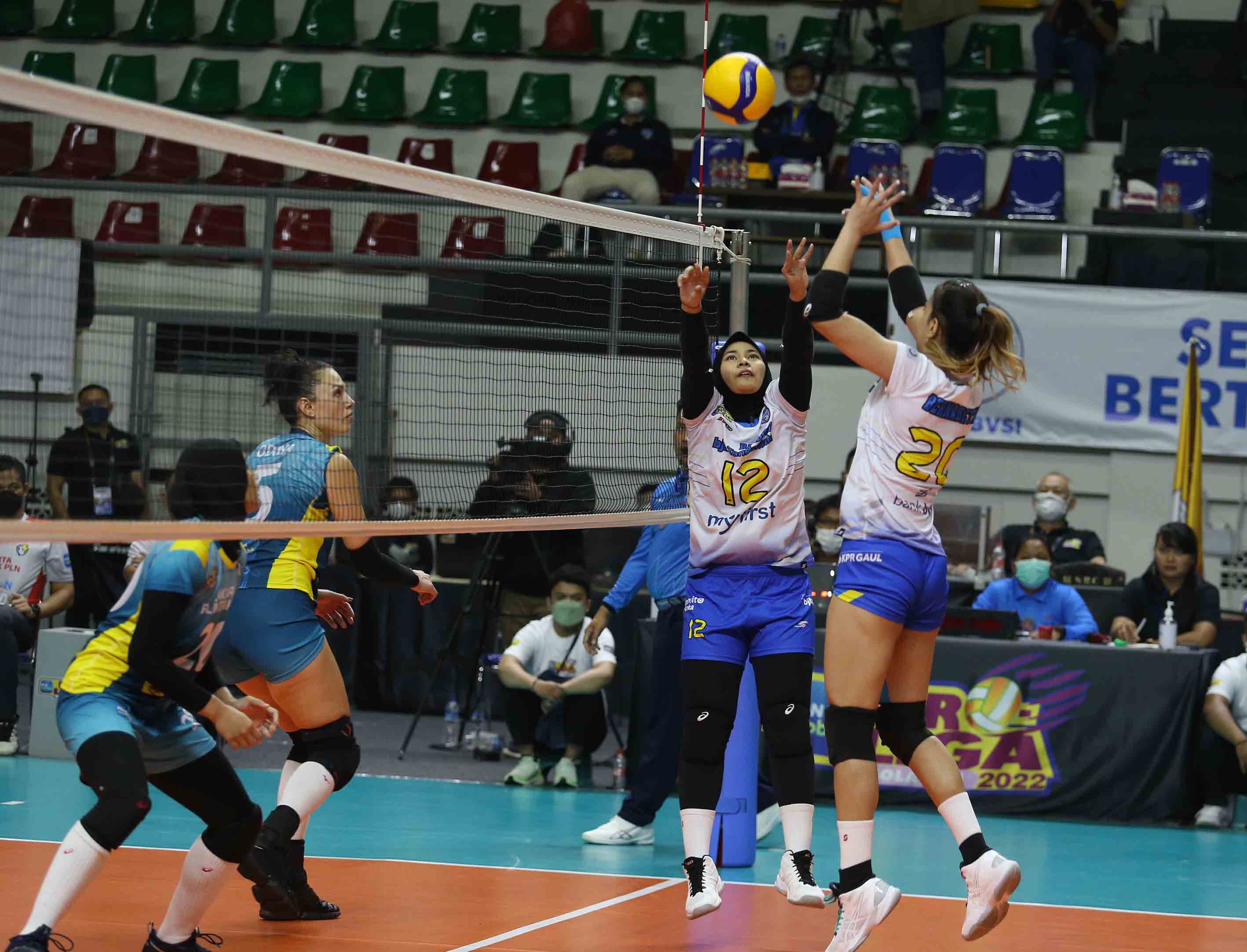 Annisa Siti Rahmawati (12) pemain bola voli putri Bandung BJB Tandamata memberikan umpan bola ke rekannya. Bandung BJB Tandamata berhasil menang atas Jakarta Elektrik PLN dengan skor 3-2. Pertandingan Proliga 2022 putaran pertama yang berlangsung di GOR Padepokan Voli Jenderal Polisi Kunarto, Sentul, Jum’at (18/2/2022). (Foto : Erly Bahtiar/Sportsmoment.id)