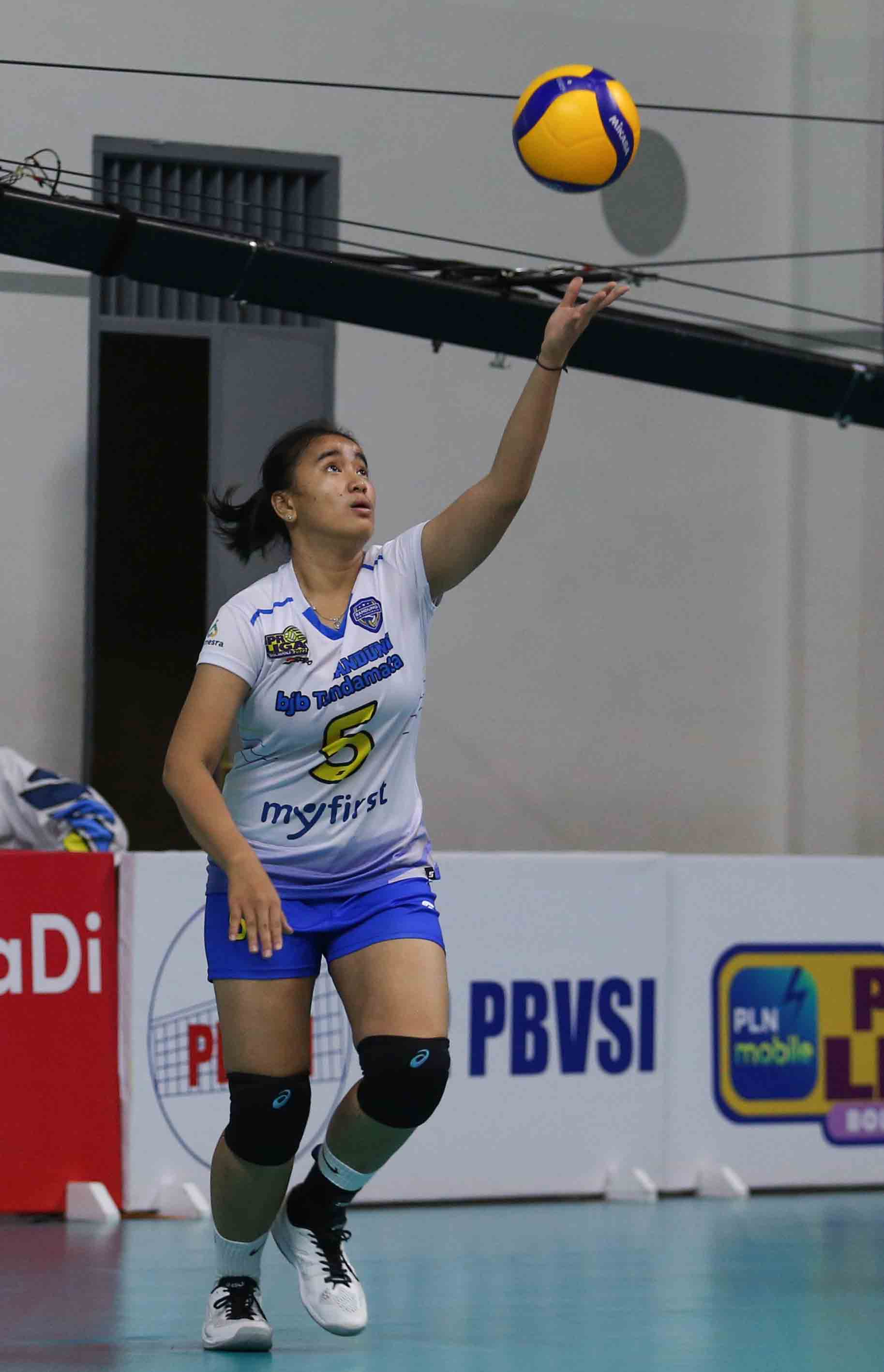 Adelia Almaida Zulfa (5) pemain bola voli putri Bandung BJB Tandamata melakukan servis ke arah lawan. Bandung BJB Tandamata berhasil menang atas Jakarta Elektrik PLN dengan skor 3-2. Pertandingan Proliga 2022 putaran pertama yang berlangsung di GOR Padepokan Voli Jenderal Polisi Kunarto, Sentul, Jum’at (18/2/2022). (Foto : Erly Bahtiar/Sportsmoment.id)