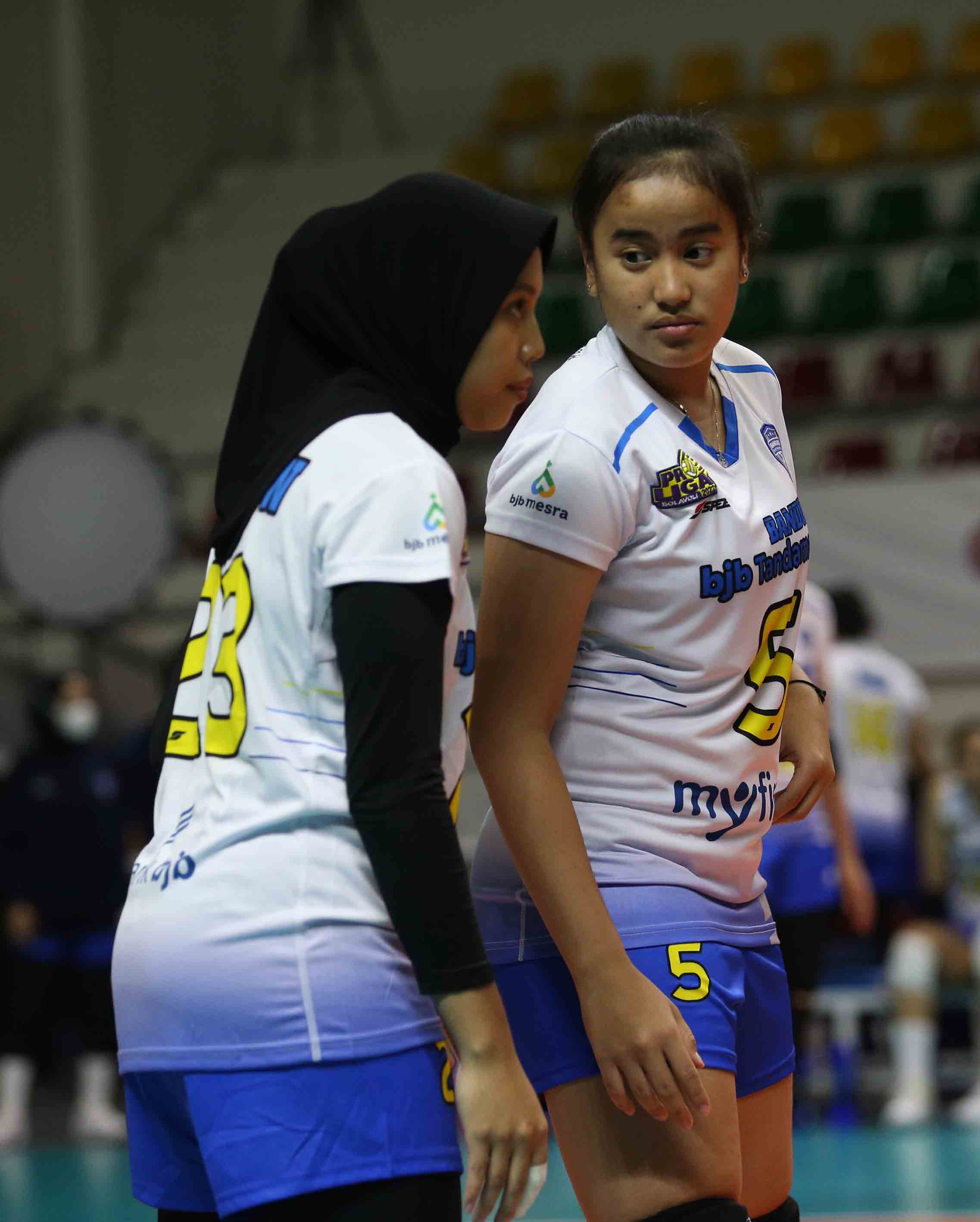 Adelia Almaida Zulfa (5) pemain bola voli putri Bandung BJB Tandamata sedang merancang strategi bersama rekannya. Bandung BJB Tandamata berhasil menang atas Jakarta Elektrik PLN dengan skor 3-2. Pertandingan Proliga 2022 putaran pertama yang berlangsung di GOR Padepokan Voli Jenderal Polisi Kunarto, Sentul, Jum’at (18/2/2022). (Foto : Erly Bahtiar/Sportsmoment.id)