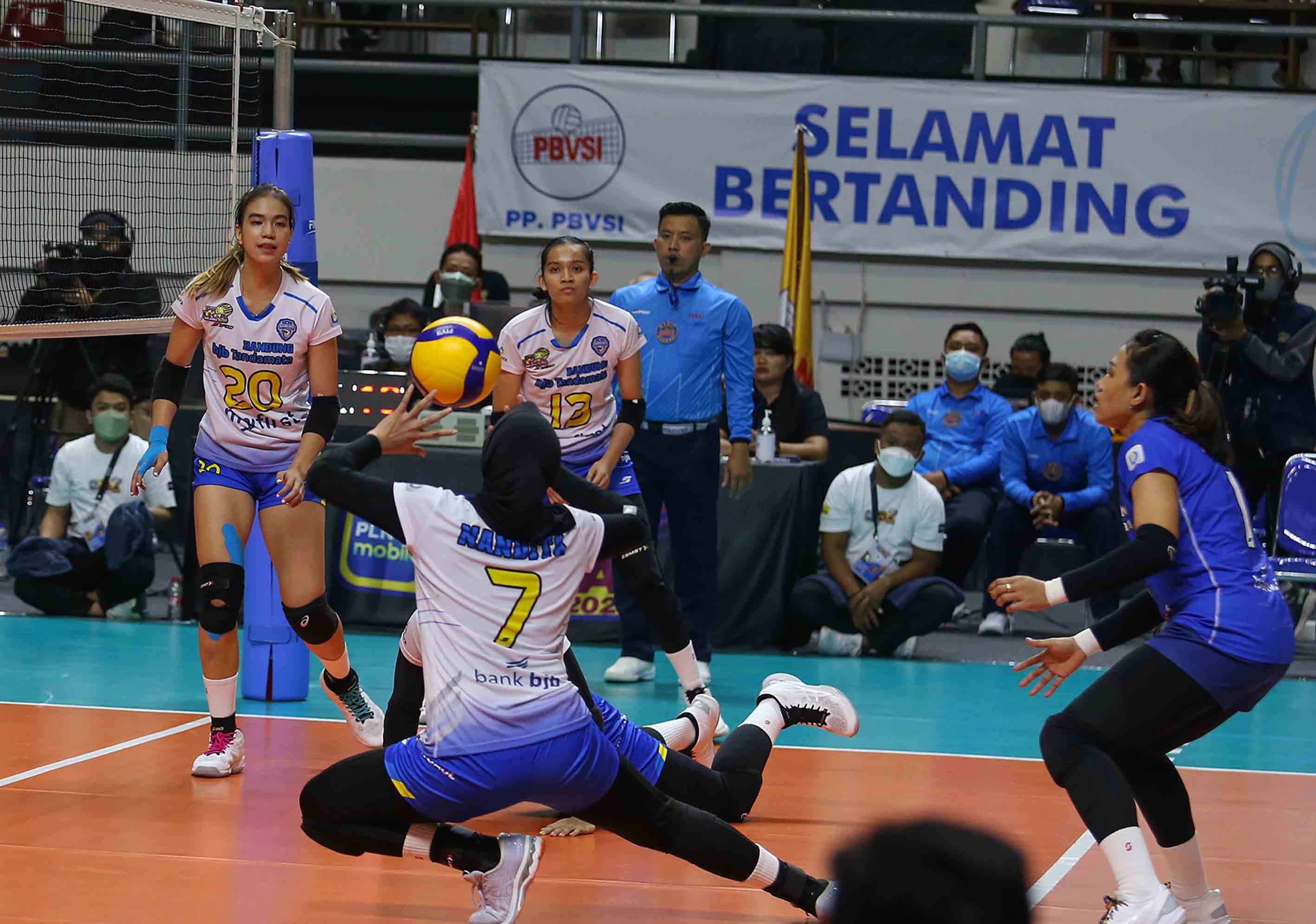 Nandita Ayu Salsabilla (7) pemain bola voli putri Bandung BJB Tandamata memberikan umpan bola ke rekannya. Bandung BJB Tandamata berhasil menang atas Jakarta Elektrik PLN dengan skor 3-2. Pertandingan Proliga 2022 putaran pertama yang berlangsung di GOR Padepokan Voli Jenderal Polisi Kunarto, Sentul, Jum’at (18/2/2022). (Foto : Erly Bahtiar/Sportsmoment.id)