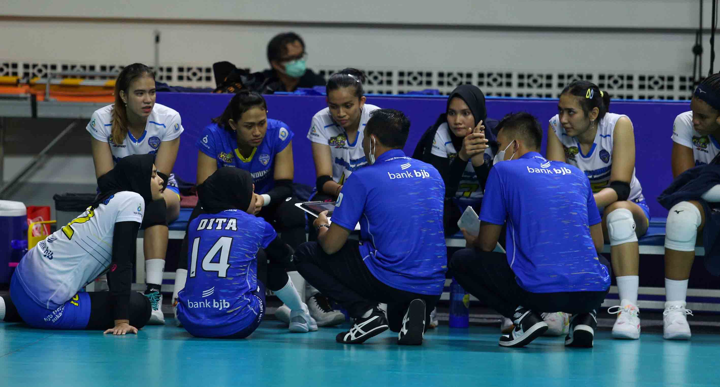 Pelatih team voli putri Bandung BJB Tandamata sedang memberikan arahan kepada para pemainnya. Bandung BJB Tandamata berhasil menang atas Jakarta Elektrik PLN dengan skor 3-2. Pertandingan Proliga 2022 putaran pertama yang berlangsung di GOR Padepokan Voli Jenderal Polisi Kunarto, Sentul, Jum’at (18/2/2022). (Foto : Erly Bahtiar/Sportsmoment.id)