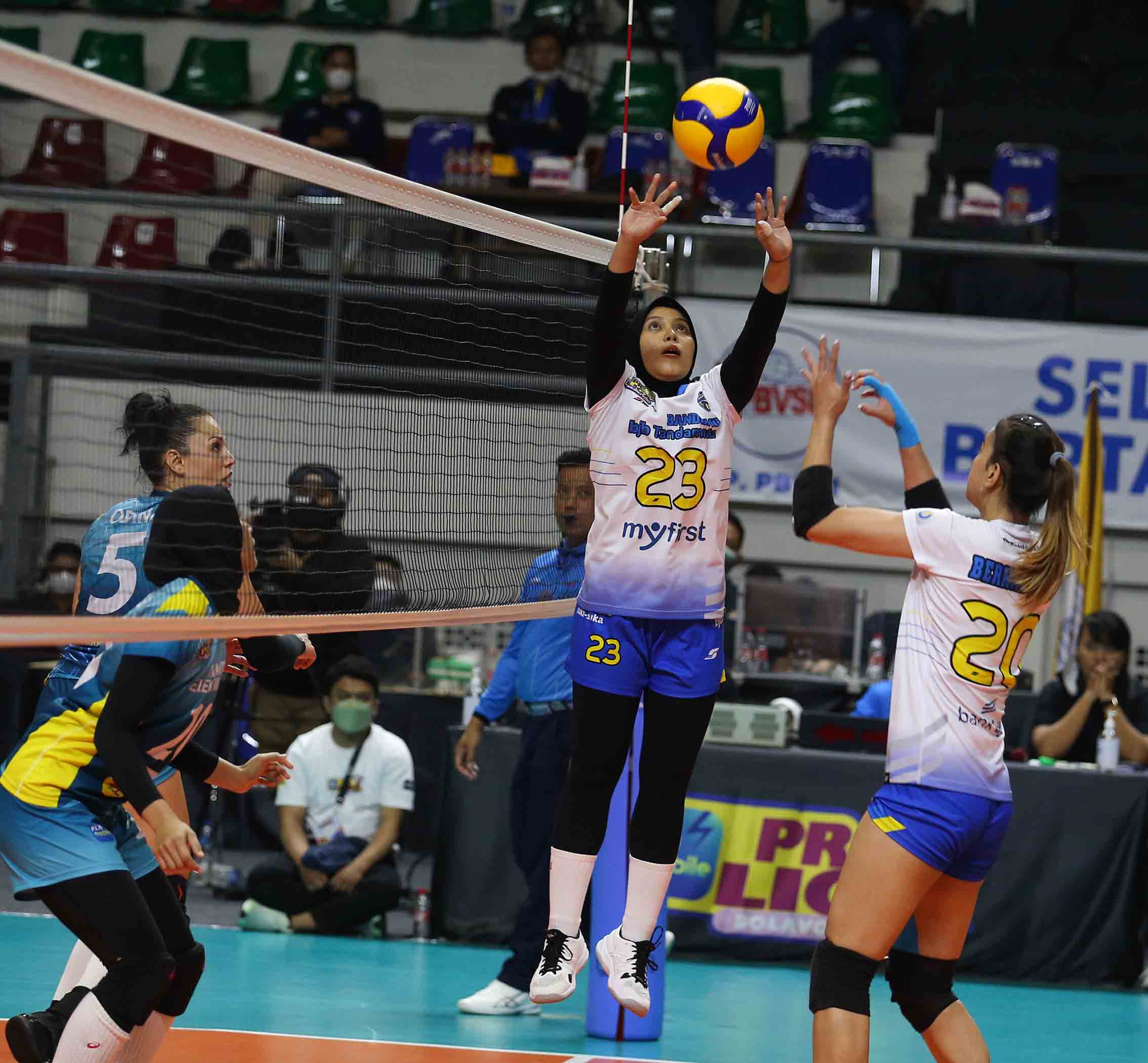Dian Pratiwi (23) pemain bola voli putri Bandung BJB Tandamata memberikan umpan bola ke rekannya. Bandung BJB Tandamata berhasil menang atas Jakarta Elektrik PLN dengan skor 3-2. Pertandingan Proliga 2022 putaran pertama yang berlangsung di GOR Padepokan Voli Jenderal Polisi Kunarto, Sentul, Jum’at (18/2/2022). (Foto : Erly Bahtiar/Sportsmoment.id)