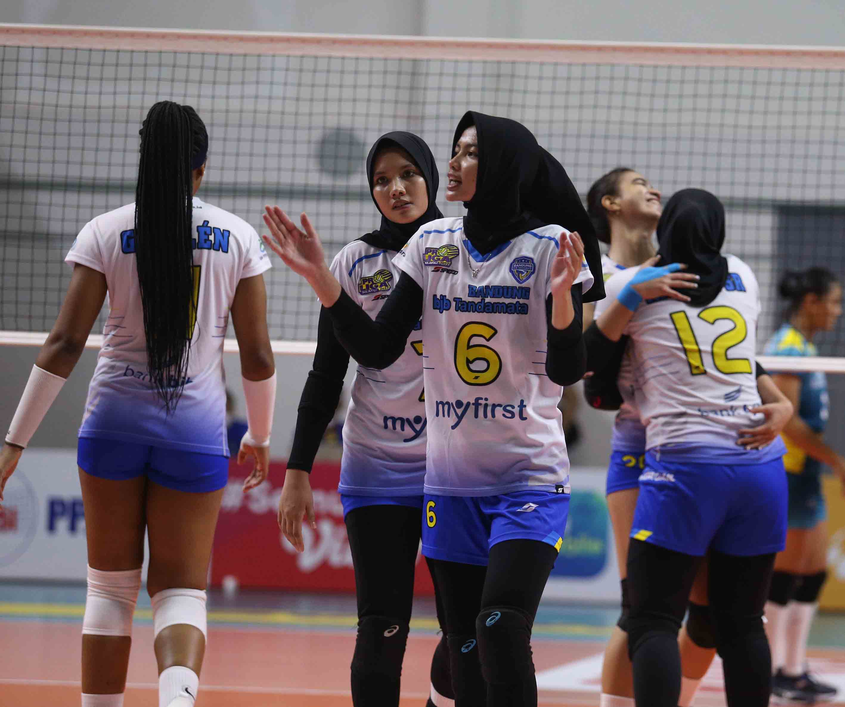 Wintang Dyah Kumala S (6) memberikan semangat kepada rekan-rekannya. Bandung BJB Tandamata berhasil menang atas Jakarta Elektrik PLN dengan skor 3-2. Pertandingan Proliga 2022 putaran pertama yang berlangsung di GOR Padepokan Voli Jenderal Polisi Kunarto, Sentul, Jum’at (18/2/2022). (Foto : Erly Bahtiar/Sportsmoment.id)