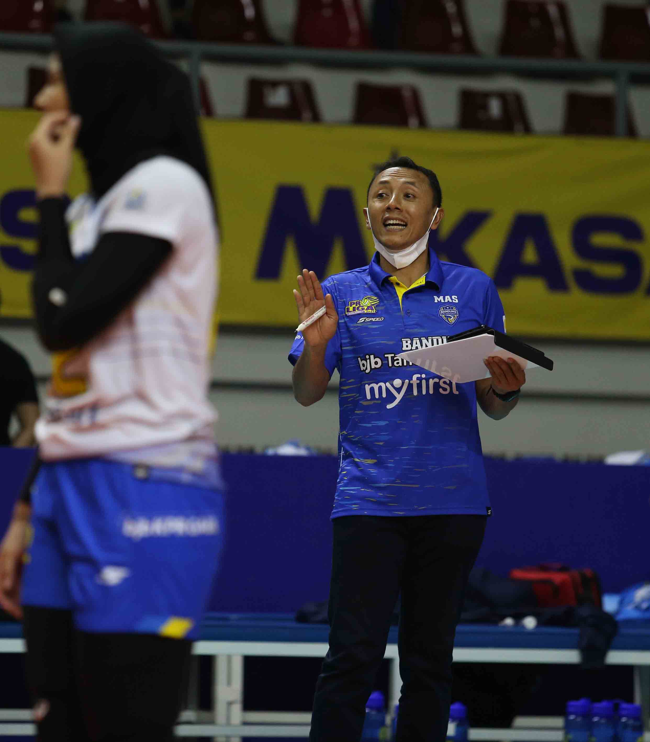 Pelatih tim voli putri Bandung BJB Tandamata, Alim Seseno memberikan sedang memberikan arahan kepada anak asuhnya. Bandung BJB Tandamata berhasil menang atas Jakarta Elektrik PLN dengan skor 3-2. Pertandingan Proliga 2022 putaran pertama yang berlangsung di GOR Padepokan Voli Jenderal Polisi Kunarto, Sentul, Jum’at (18/2/2022). (Foto : Erly Bahtiar/Sportsmoment.id)