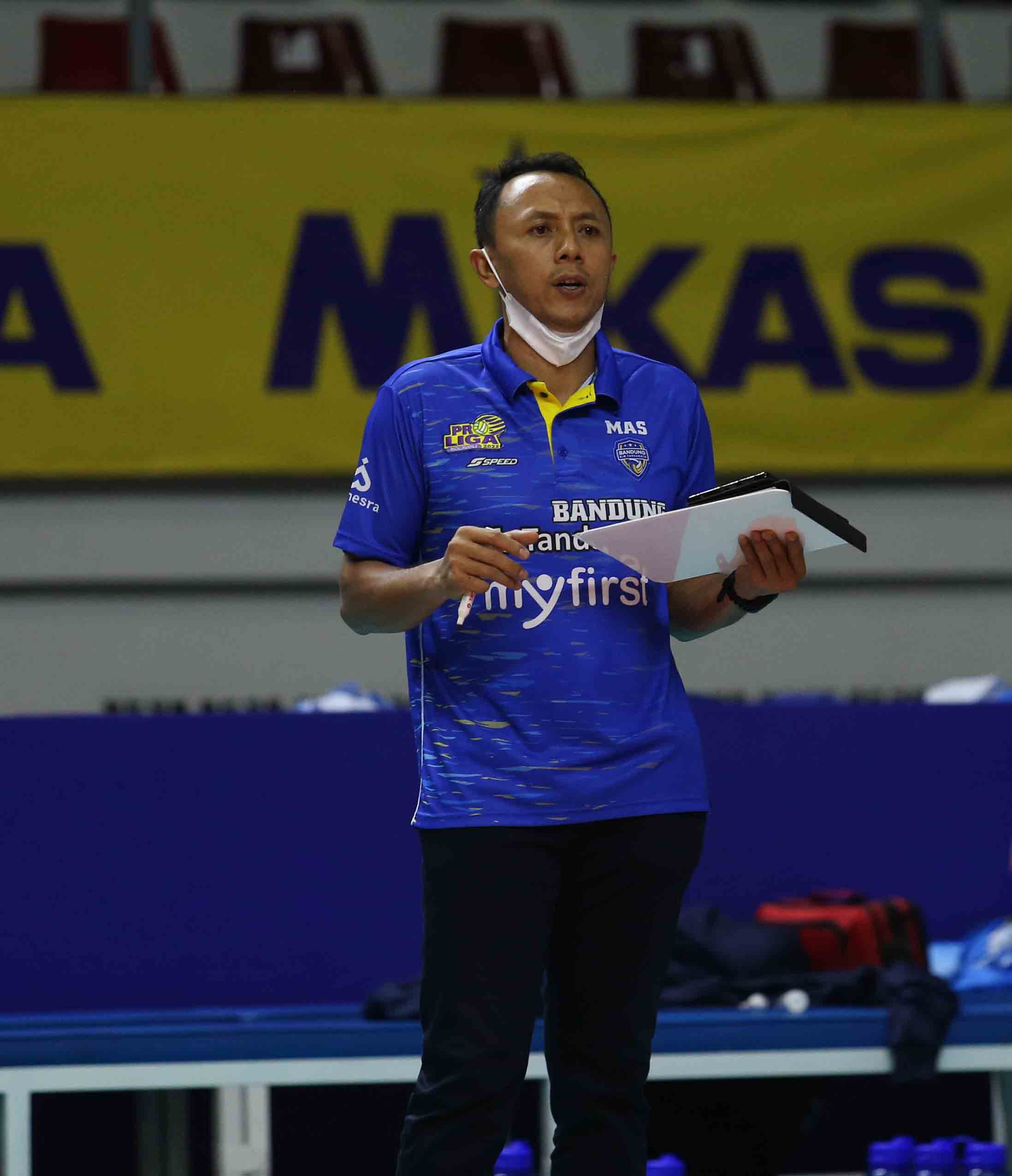 Pelatih tim voli putri Bandung BJB Tandamata, Alim Seseno memberikan sedang memberikan arahan kepada anak asuhnya. Bandung BJB Tandamata berhasil menang atas Jakarta Elektrik PLN dengan skor 3-2. Pertandingan Proliga 2022 putaran pertama yang berlangsung di GOR Padepokan Voli Jenderal Polisi Kunarto, Sentul, Jum’at (18/2/2022). (Foto : Erly Bahtiar/Sportsmoment.id)