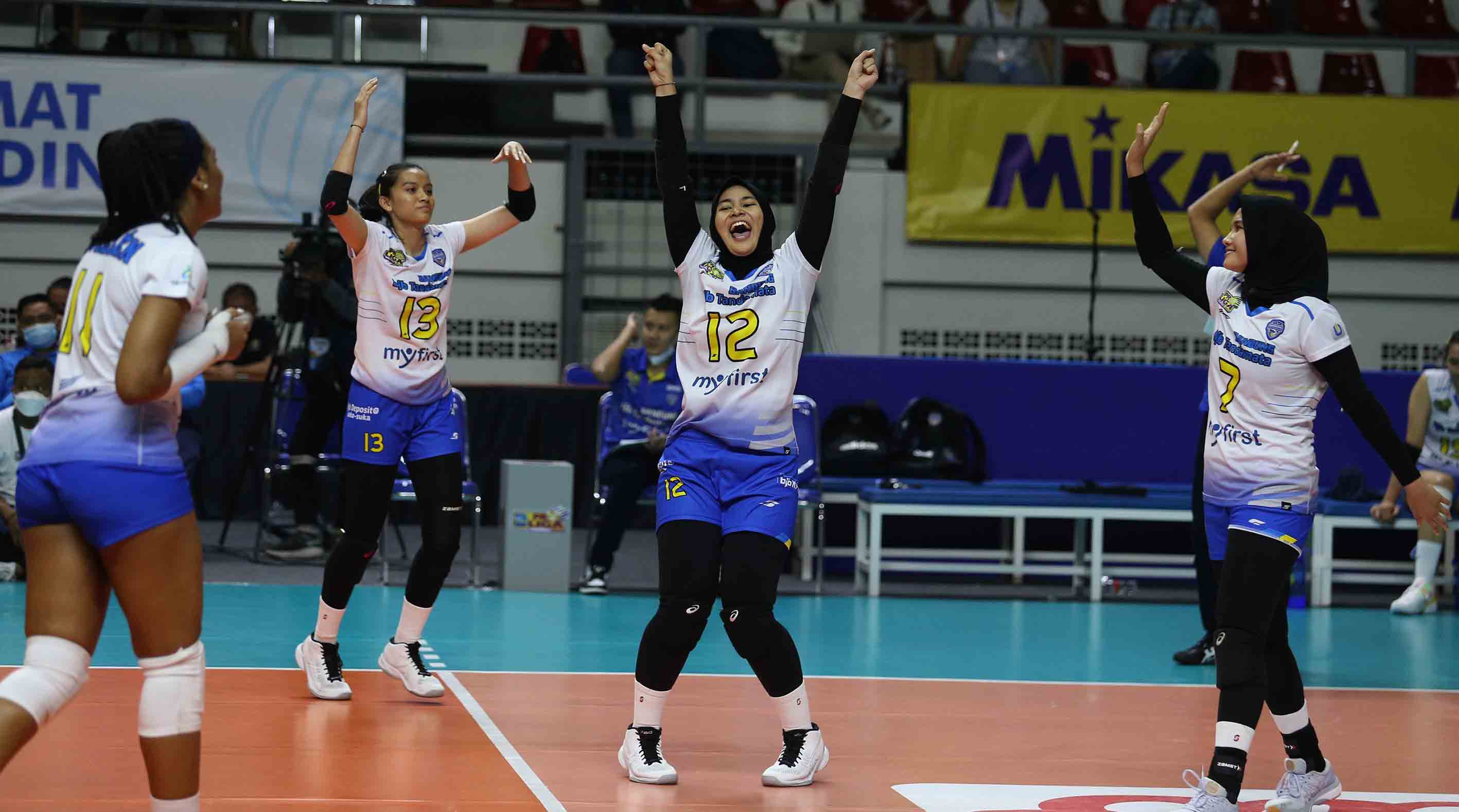 Annisa Siti Rahmawati (12) meluapkan emosi kegembiraan bersama rekan-rekannya setelah mendapat poin bagi tim bola voli Bandung BJB Tandamata. Tim bola voli putri Bandung BJB Tandamata berhasil menang atas Jakarta Elektrik PLN dengan skor 3-2 (25-22, 25-23,18-25, 21-25, 15-10). Pertandingan Proliga 2022 putaran kedua yang berlangsung di GOR Padepokan Voli Jenderal Polisi Kunarto, Sentul, Jumat (18/2/2022). (Foto : Erly Bahtiar/Sportsmoment.id)