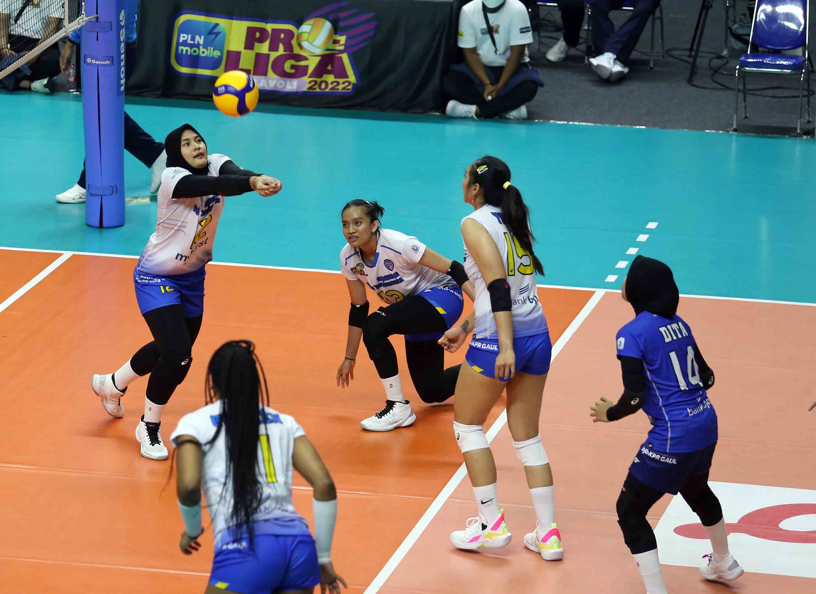 Annisa Siti Rahmawati (12) memberikan umpan bola ke rekannya. Tim bola voli putri Bandung BJB Tandamata berhasil menang atas Jakarta Elektrik PLN dengan skor 3-2 (25-22, 25-23,18-25, 21-25, 15-10). Pertandingan Proliga 2022 putaran kedua yang berlangsung di GOR Padepokan Voli Jenderal Polisi Kunarto, Sentul, Jumat (18/2/2022). (Foto : Erly Bahtiar/Sportsmoment.id)