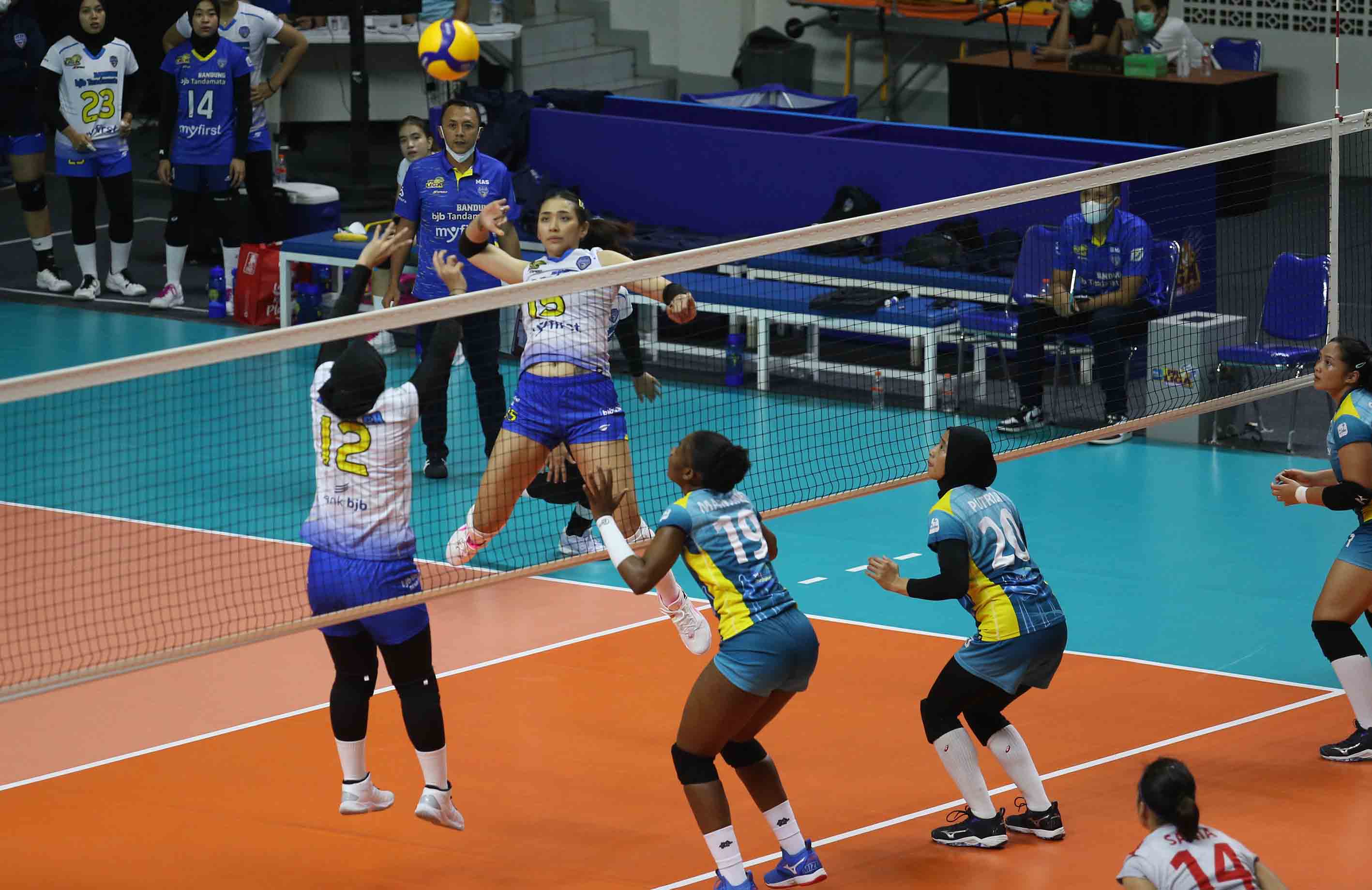 Yola Yuliana (15) pemain bola voli Bandung BJB Tandamata mengarahkan pukulan smashnya ke area lawan. Tim bola voli putri Bandung BJB Tandamata berhasil menang atas Jakarta Elektrik PLN dengan skor 3-2 (25-22, 25-23,18-25, 21-25, 15-10). Pertandingan Proliga 2022 putaran kedua yang berlangsung di GOR Padepokan Voli Jenderal Polisi Kunarto, Sentul, Jumat (18/2/2022). (Foto : Erly Bahtiar/Sportsmoment.id)