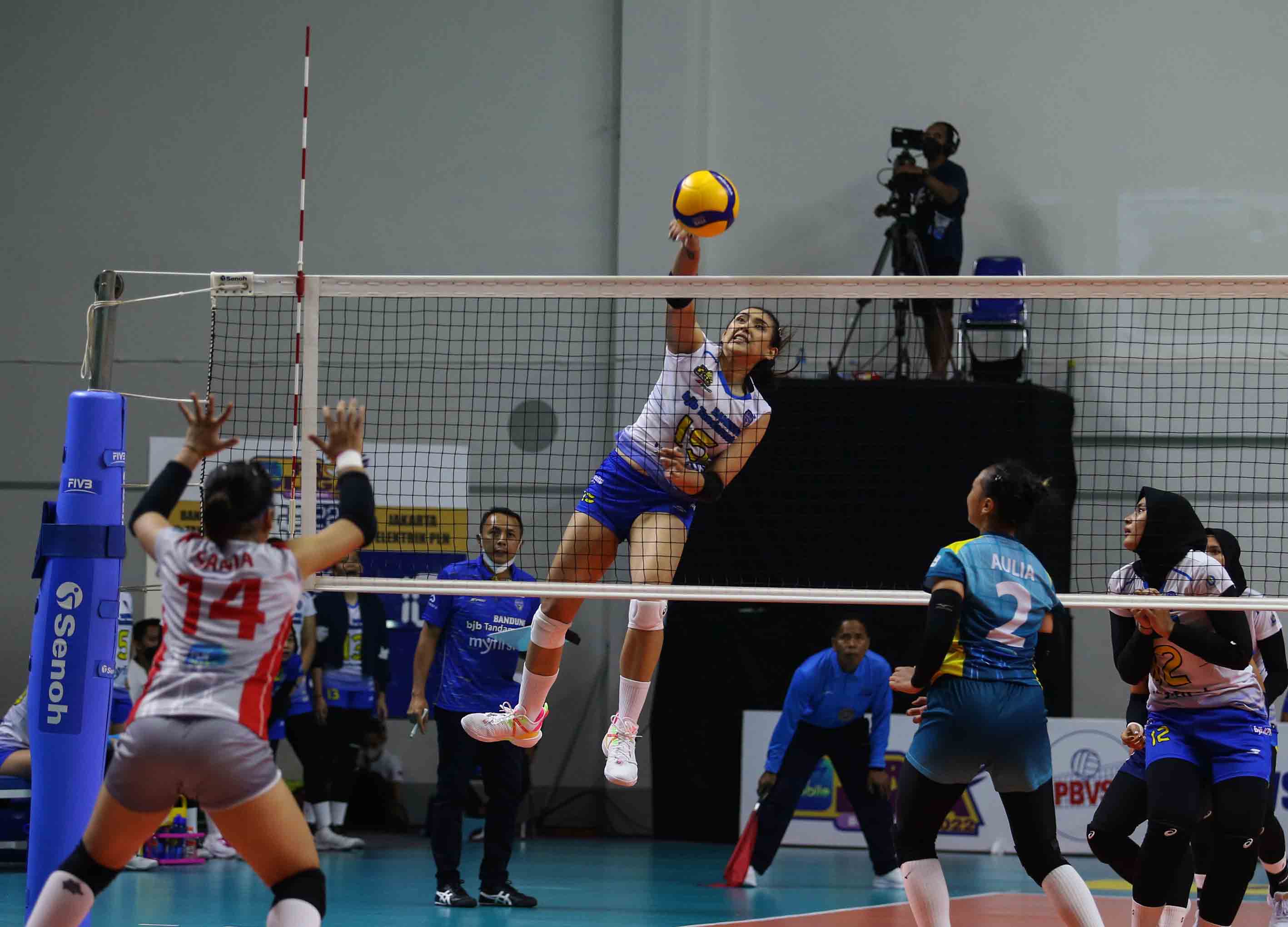 Yola Yuliana (15) pemain bola voli Bandung BJB Tandamata mengarahkan pukulan smashnya ke area lawan. Tim bola voli putri Bandung BJB Tandamata berhasil menang atas Jakarta Elektrik PLN dengan skor 3-2 (25-22, 25-23,18-25, 21-25, 15-10). Pertandingan Proliga 2022 putaran kedua yang berlangsung di GOR Padepokan Voli Jenderal Polisi Kunarto, Sentul, Jumat (18/2/2022). (Foto : Erly Bahtiar/Sportsmoment.id)