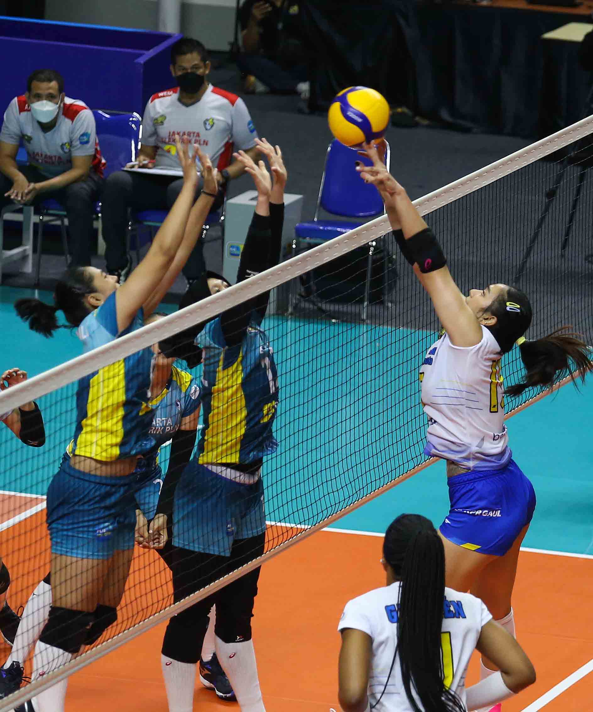 Yola Yuliana (15) pemain bola voli Bandung BJB Tandamata menahan bola pukulan pemain Jakarta Elektrik PLN. Tim bola voli putri Bandung BJB Tandamata berhasil menang atas Jakarta Elektrik PLN dengan skor 3-2 (25-22, 25-23,18-25, 21-25, 15-10). Pertandingan Proliga 2022 putaran kedua yang berlangsung di GOR Padepokan Voli Jenderal Polisi Kunarto, Sentul, Jumat (18/2/2022). (Foto : Erly Bahtiar/Sportsmoment.id)
