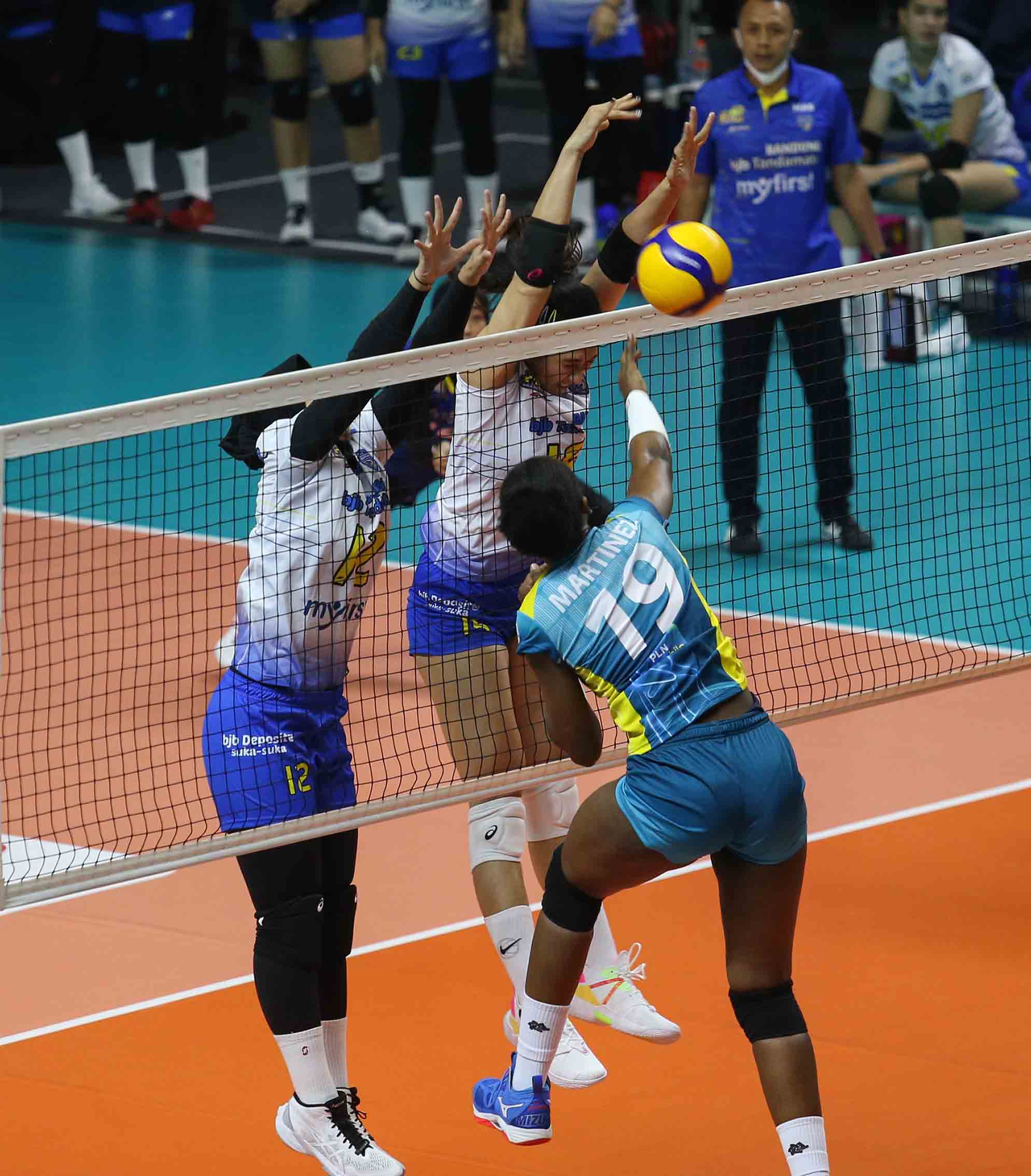 Yola Yuliana (15) pemain bola voli Bandung BJB Tandamata menahan bola pukulan pemain Jakarta Elektrik PLN. Tim bola voli putri Bandung BJB Tandamata berhasil menang atas Jakarta Elektrik PLN dengan skor 3-2 (25-22, 25-23,18-25, 21-25, 15-10). Pertandingan Proliga 2022 putaran kedua yang berlangsung di GOR Padepokan Voli Jenderal Polisi Kunarto, Sentul, Jumat (18/2/2022). (Foto : Erly Bahtiar/Sportsmoment.id)