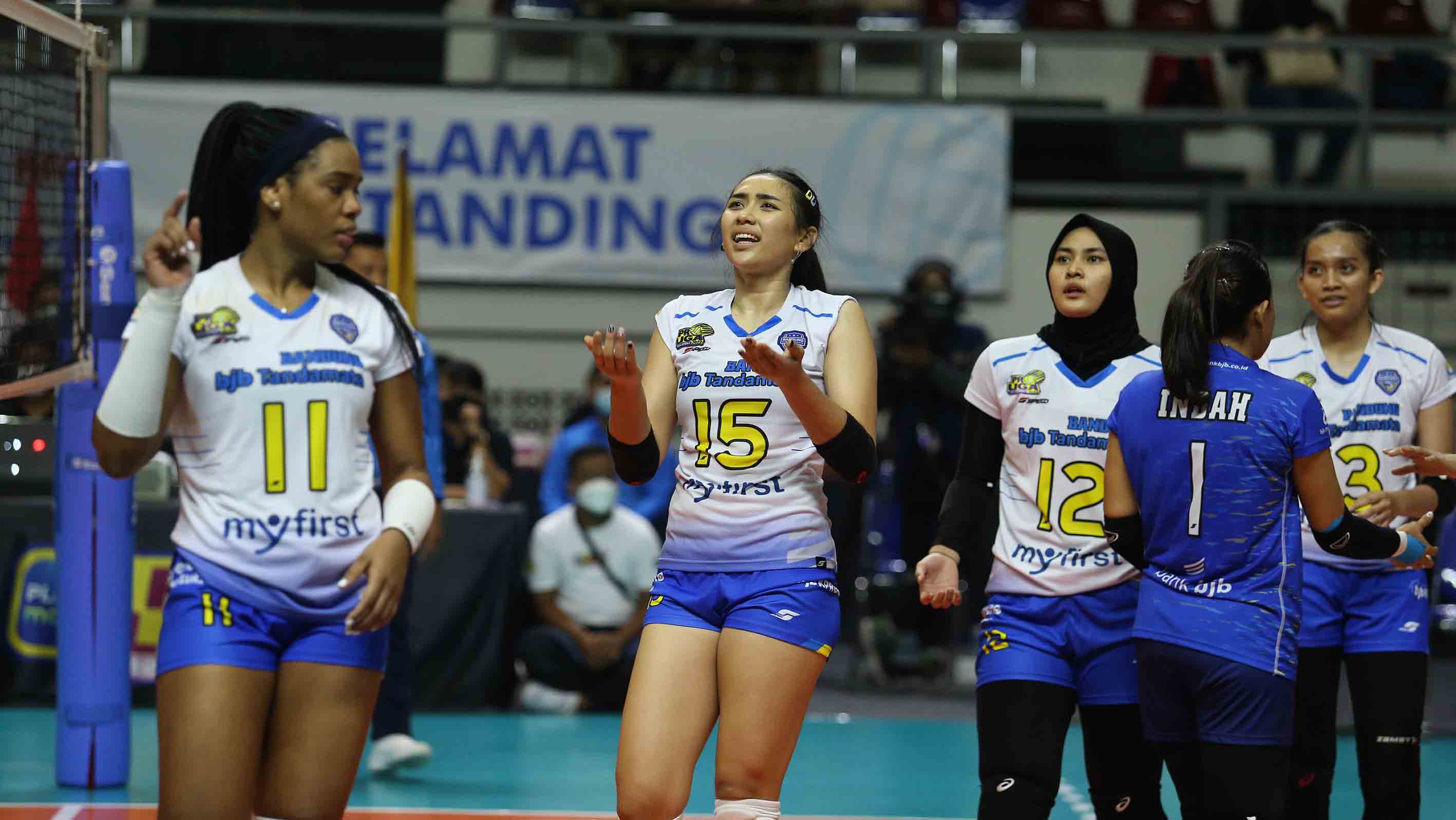 Yola Yuliana (15) mengajukan protes kepada wasit yang memimpin jalannya pertandingan. Tim bola voli putri Bandung BJB Tandamata berhasil menang atas Jakarta Elektrik PLN dengan skor 3-2 (25-22, 25-23,18-25, 21-25, 15-10). Pertandingan Proliga 2022 putaran kedua yang berlangsung di GOR Padepokan Voli Jenderal Polisi Kunarto, Sentul, Jumat (18/2/2022). (Foto : Erly Bahtiar/Sportsmoment.id)