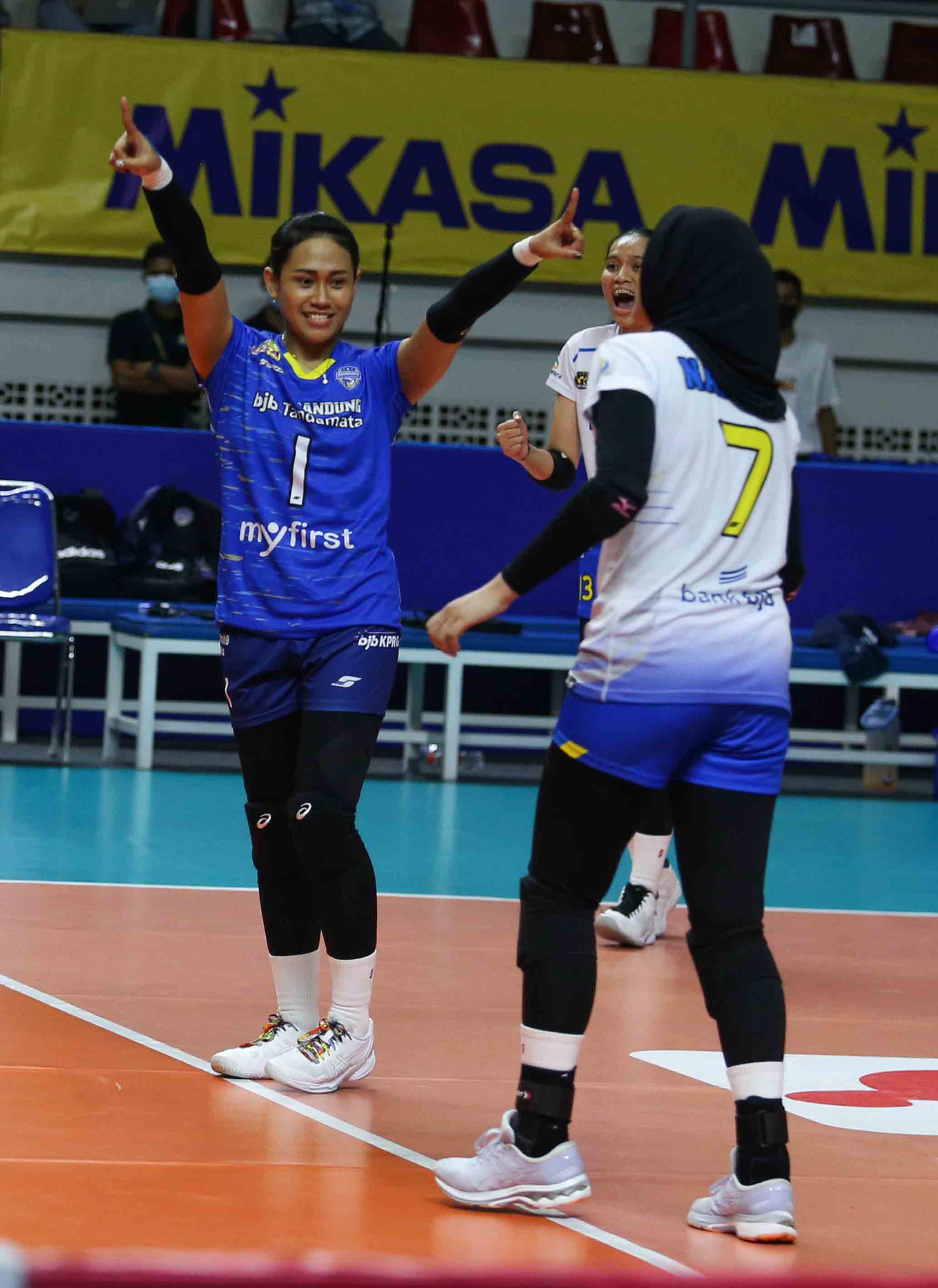 Yulis Indahyani (1) meluapkan emosi kegembiraan setelah berhasil mendapatkan poin untuk tim Bandung BJB Tandamata. Tim bola voli putri Bandung BJB Tandamata berhasil menang atas Jakarta Elektrik PLN dengan skor 3-2 (25-22, 25-23,18-25, 21-25, 15-10). Pertandingan Proliga 2022 putaran kedua yang berlangsung di GOR Padepokan Voli Jenderal Polisi Kunarto, Sentul, Jumat (18/2/2022). (Foto : Erly Bahtiar/Sportsmoment.id)