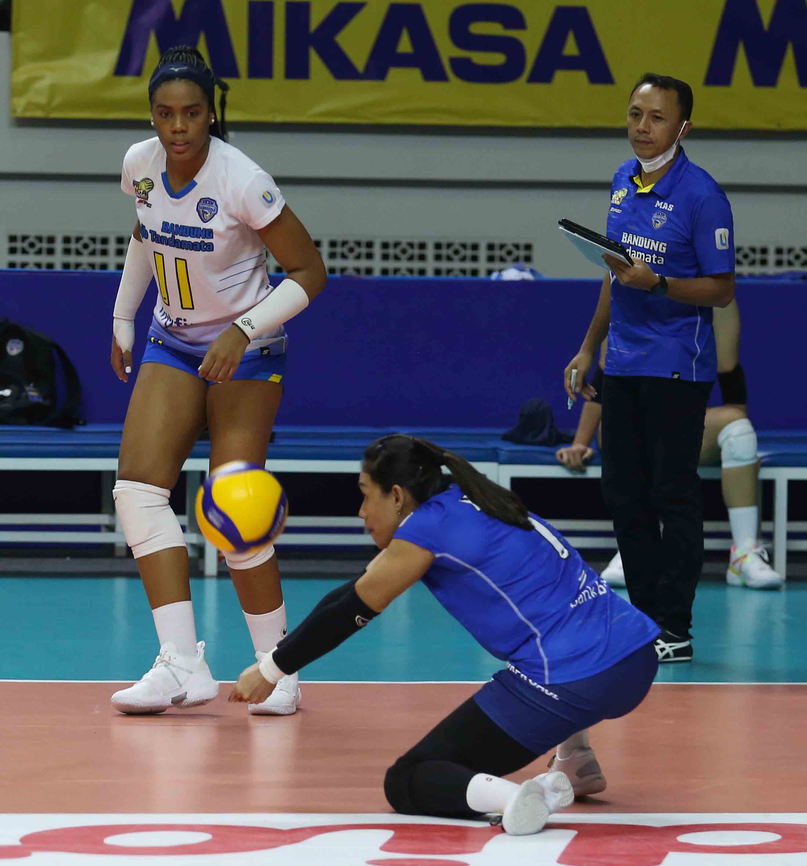 Yulis Indahyani (1) menerima bola lawan. Tim bola voli putri Bandung BJB Tandamata berhasil menang atas Jakarta Elektrik PLN dengan skor 3-2 (25-22, 25-23,18-25, 21-25, 15-10). Pertandingan Proliga 2022 putaran kedua yang berlangsung di GOR Padepokan Voli Jenderal Polisi Kunarto, Sentul, Jumat (18/2/2022). (Foto : Erly Bahtiar/Sportsmoment.id)