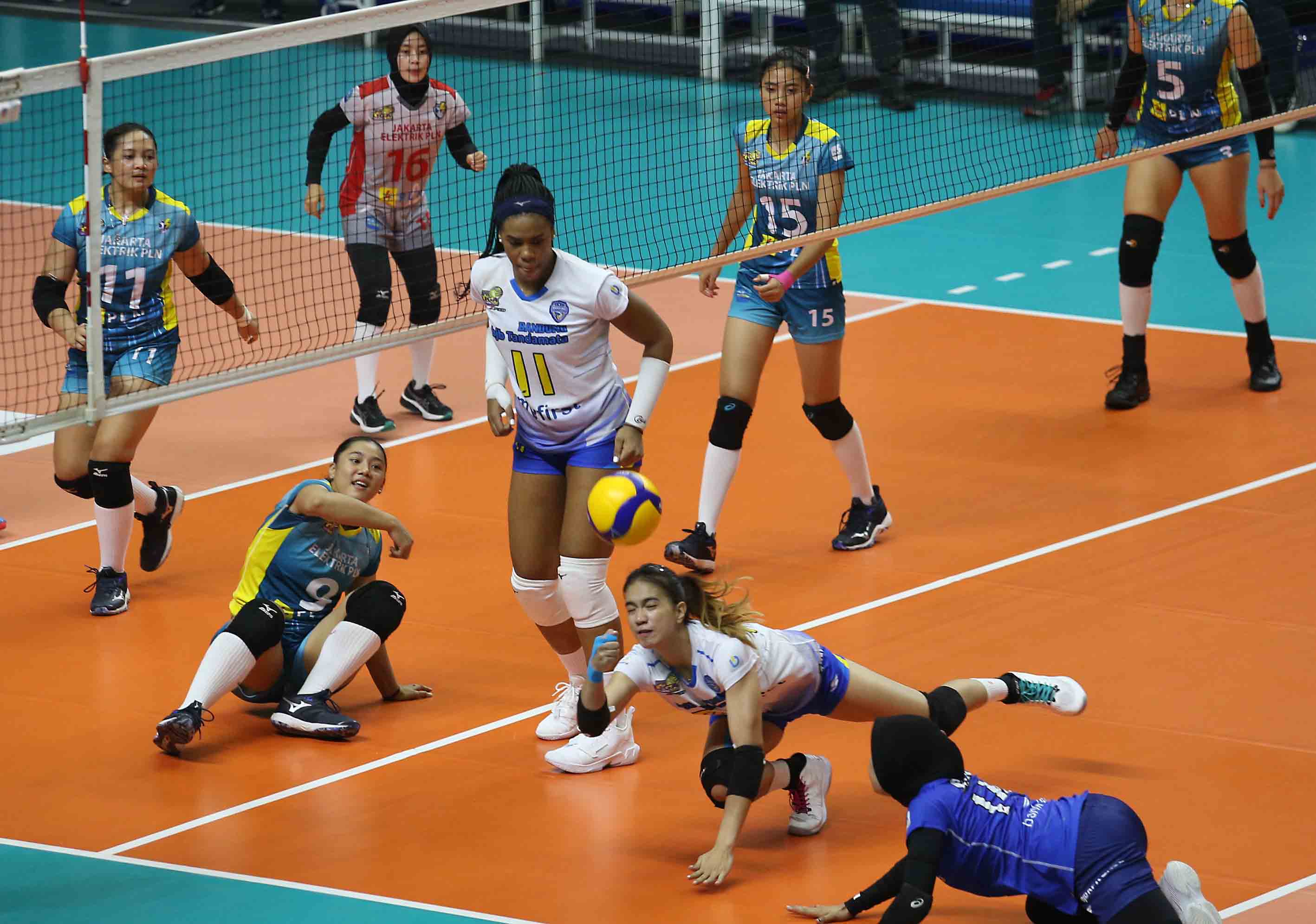 Shella Bernadetha Onnan (20) berupaya menyelamatkan bola block dari Jakarta Elektrik PLN . Tim bola voli putri Bandung BJB Tandamata berhasil menang atas Jakarta Elektrik PLN dengan skor 3-2 (25-22, 25-23,18-25, 21-25, 15-10). Pertandingan Proliga 2022 putaran kedua yang berlangsung di GOR Padepokan Voli Jenderal Polisi Kunarto, Sentul, Jumat (18/2/2022). (Foto : Erly Bahtiar/Sportsmoment.id).