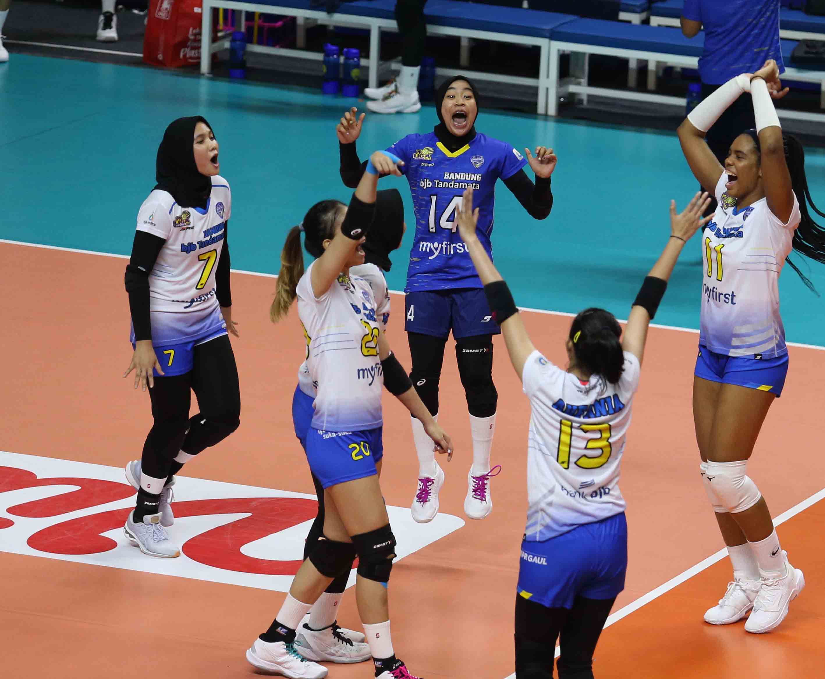 Dita Azizah (14) pemain bola voli putri Bandung BJB Tandamata bersama rekan-rekannya meluapkan emosi kegembiraan setelah mendapatkan poin. Bandung BJB Tandamata berhasil menang atas Jakarta Elektrik PLN dengan skor 3-2. Pertandingan Proliga 2022 putaran pertama yang berlangsung di GOR Padepokan Voli Jenderal Polisi Kunarto, Sentul, Jum’at (18/2/2022). (Foto : Erly Bahtiar/Sportsmoment.id)