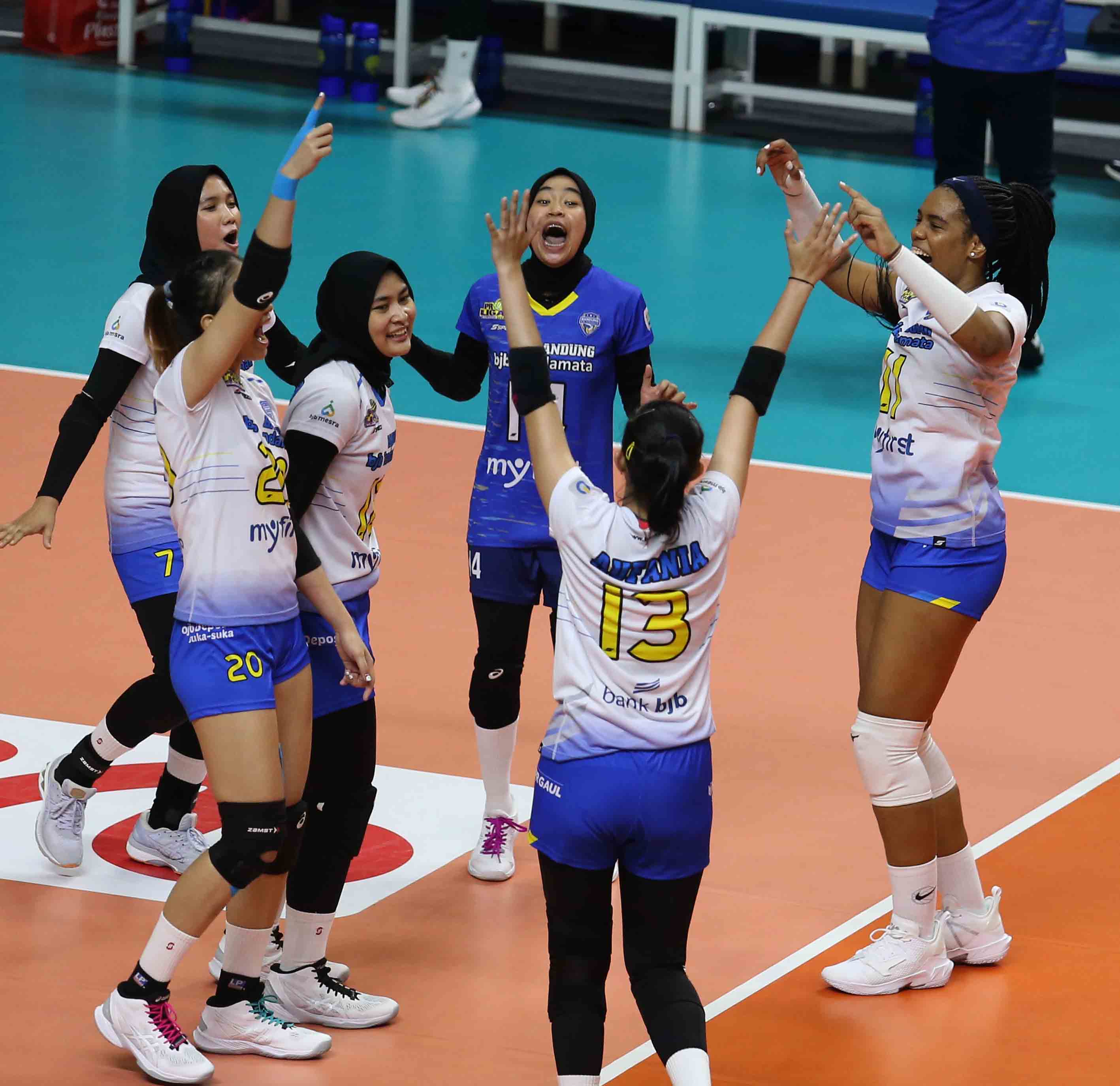 Dita Azizah (14) pemain bola voli putri Bandung BJB Tandamata bersama rekan-rekannya meluapkan emosi kegembiraan setelah mendapatkan poin. Bandung BJB Tandamata berhasil menang atas Jakarta Elektrik PLN dengan skor 3-2. Pertandingan Proliga 2022 putaran pertama yang berlangsung di GOR Padepokan Voli Jenderal Polisi Kunarto, Sentul, Jum’at (18/2/2022). (Foto : Erly Bahtiar/Sportsmoment.id)
