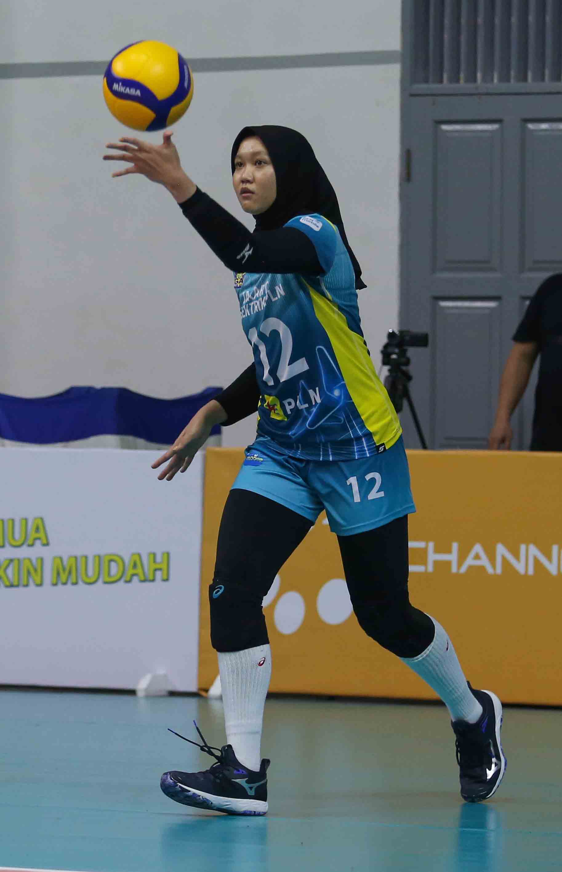 Dheka Asyifa Febriani (12) pemain bola voli putri Jakarta Elektrik PLN melakukan servis ke area lawan. Jakarta Elektrik PLN kalah atas Bandung BJB Tandamata dengan skor 2-3. Pertandingan Proliga 2022 putaran pertama yang berlangsung di GOR Padepokan Voli Jenderal Polisi Kunarto, Sentul, Jum’at (18/2/2022). (Foto : Erly Bahtiar/Sportsmoment.id)