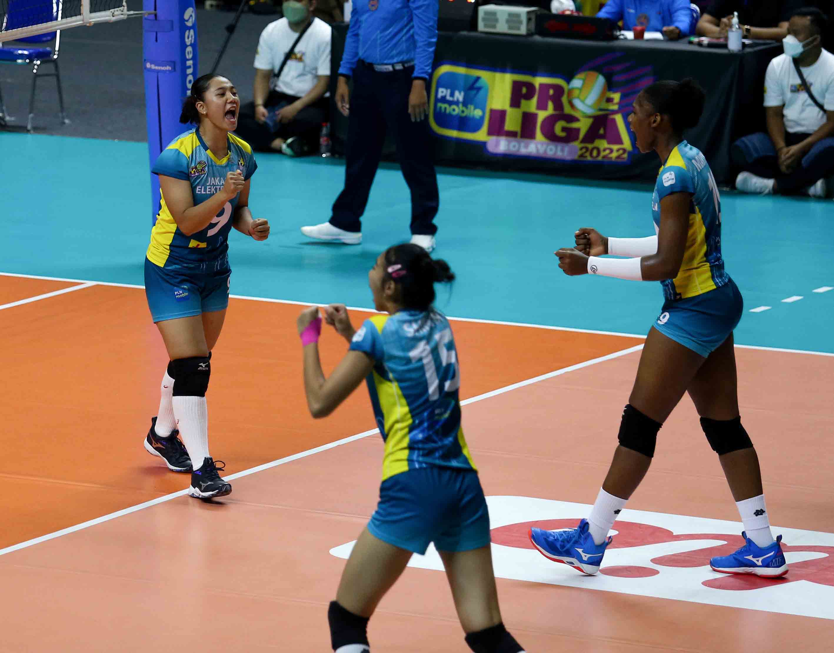 Nurlaili Kusumah Diningrat (9) pemain bola voli putri Jakarta Elektrik PLN meluapkan emosi kegembiraan karena berhasil meraih poin. Jakarta Elektrik PLN kalah atas Bandung BJB Tandamata dengan skor 2-3. Pertandingan Proliga 2022 putaran pertama yang berlangsung di GOR Padepokan Voli Jenderal Polisi Kunarto, Sentul, Jum’at (18/2/2022). (Foto : Erly Bahtiar/Sportsmoment.id)