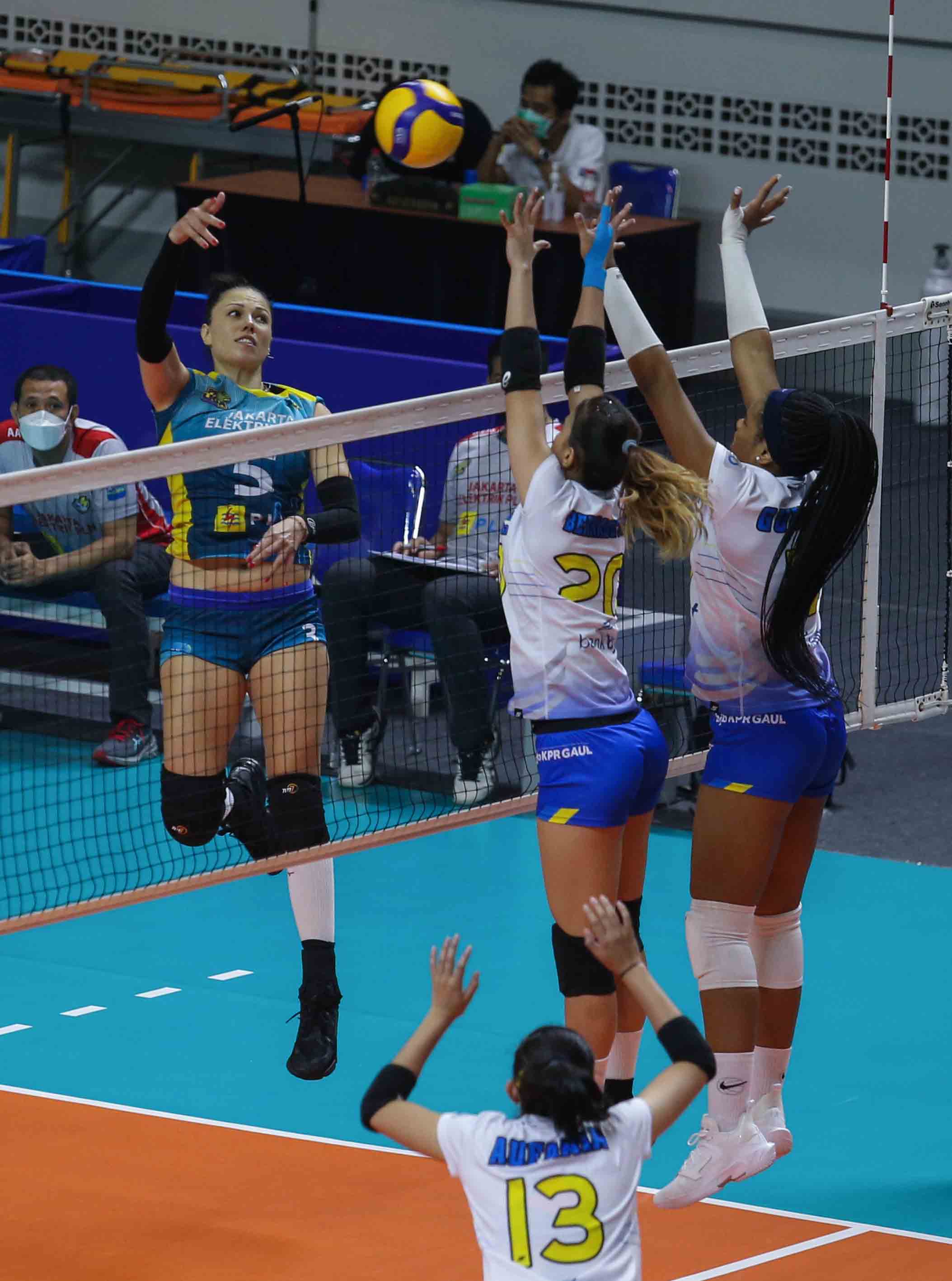 Odina Zayniddinovna (5) pemain bola voli putri Jakarta Elektrik PLN mengarahkan pukulan ke arah lawan. Jakarta Elektrik PLN kalah atas Bandung BJB Tandamata dengan skor 2-3. Pertandingan Proliga 2022 putaran pertama yang berlangsung di GOR Padepokan Voli Jenderal Polisi Kunarto, Sentul, Jum’at (18/2/2022). (Foto : Erly Bahtiar/Sportsmoment.id)