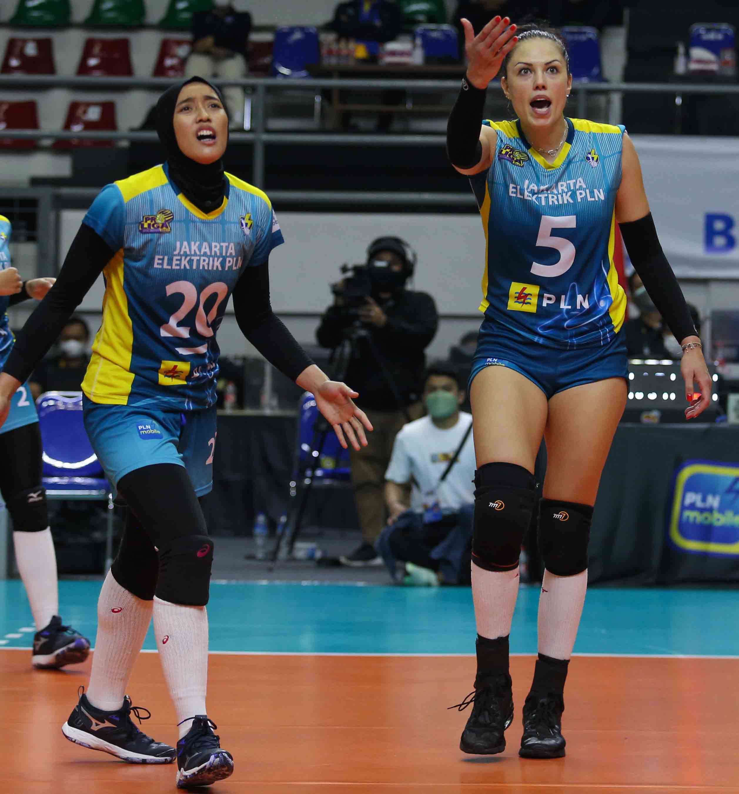 Odina Zayniddinovna (5) pemain bola voli putri Jakarta Elektrik PLN memprotes keputusan wasit yang memimpin jalannya pertandingan. Jakarta Elektrik PLN kalah atas Bandung BJB Tandamata dengan skor 2-3. Pertandingan Proliga 2022 putaran pertama yang berlangsung di GOR Padepokan Voli Jenderal Polisi Kunarto, Sentul, Jum’at (18/2/2022). (Foto : Erly Bahtiar/Sportsmoment.id)