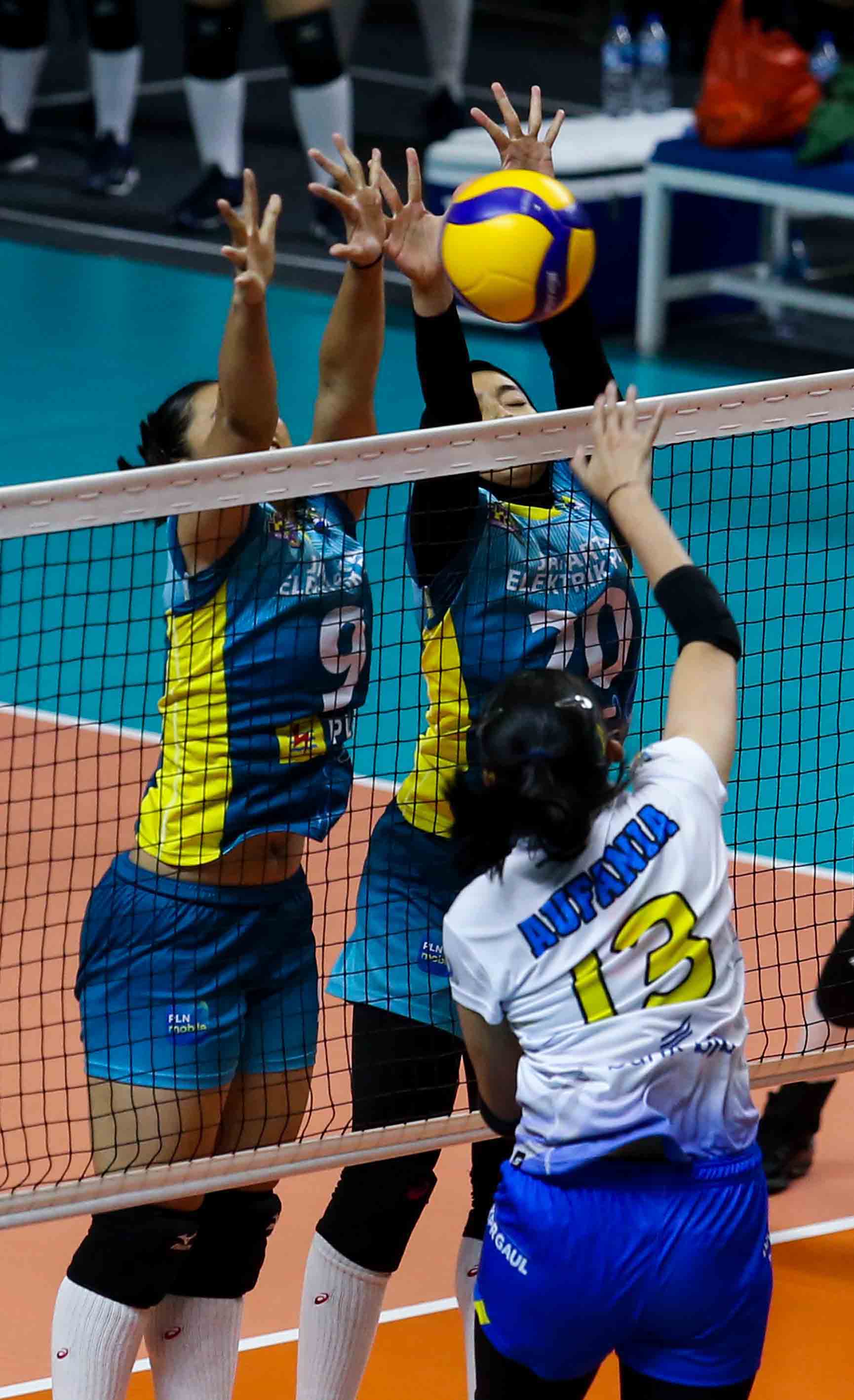Putri Andya Agustina (20) pemain bola voli putri Jakarta Elektrik PLN menahan bola pukulan pemain Bandung BJB Tandamata. Jakarta Elektrik PLN kalah atas Bandung BJB Tandamata dengan skor 2-3. Pertandingan Proliga 2022 putaran pertama yang berlangsung di GOR Padepokan Voli Jenderal Polisi Kunarto, Sentul, Jum’at (18/2/2022). (Foto : Erly Bahtiar/Sportsmoment.id)