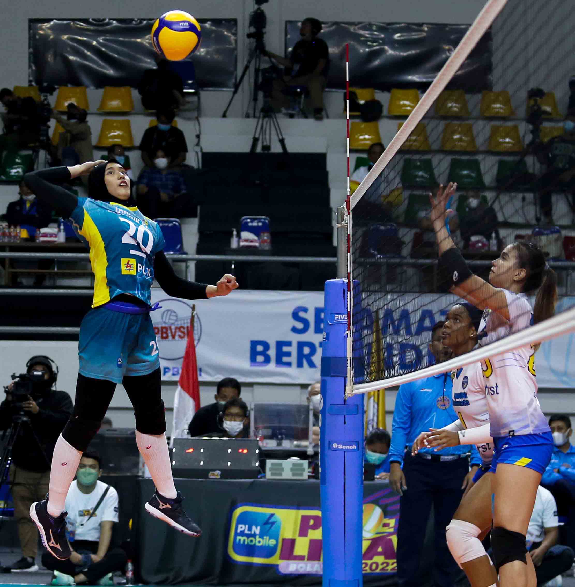 Putri Andya Agustina (20) pemain bola voli putri Jakarta Elektrik PLN mengarahkan pukulan smashnya ke arah lawan. Jakarta Elektrik PLN kalah atas Bandung BJB Tandamata dengan skor 2-3. Pertandingan Proliga 2022 putaran pertama yang berlangsung di GOR Padepokan Voli Jenderal Polisi Kunarto, Sentul, Jum’at (18/2/2022). (Foto : Erly Bahtiar/Sportsmoment.id)