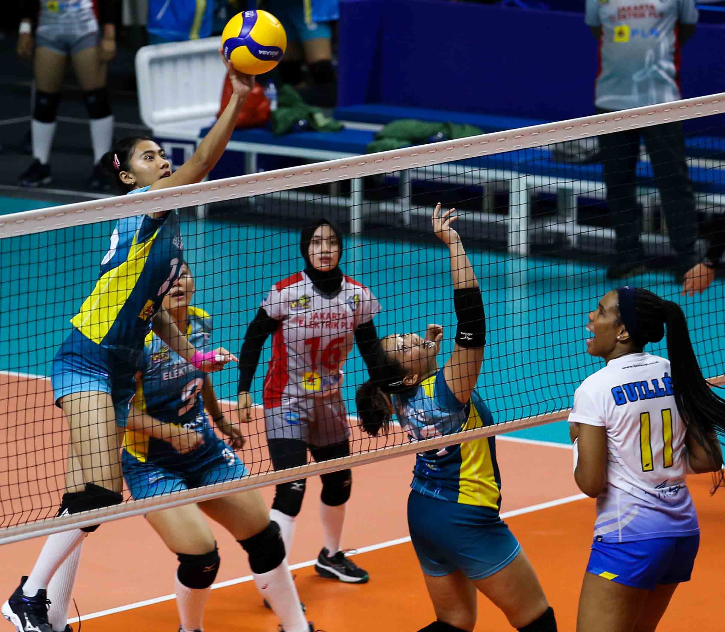 Shintia Alliva Mauludina (15) pemain bola voli putri Jakarta Elektrik PLN mengarahkan pukulan ke arah lawan. Jakarta Elektrik PLN kalah atas Bandung BJB Tandamata dengan skor 2-3. Pertandingan Proliga 2022 putaran pertama yang berlangsung di GOR Padepokan Voli Jenderal Polisi Kunarto, Sentul, Jum’at (18/2/2022). (Foto : Erly Bahtiar/Sportsmoment.id)