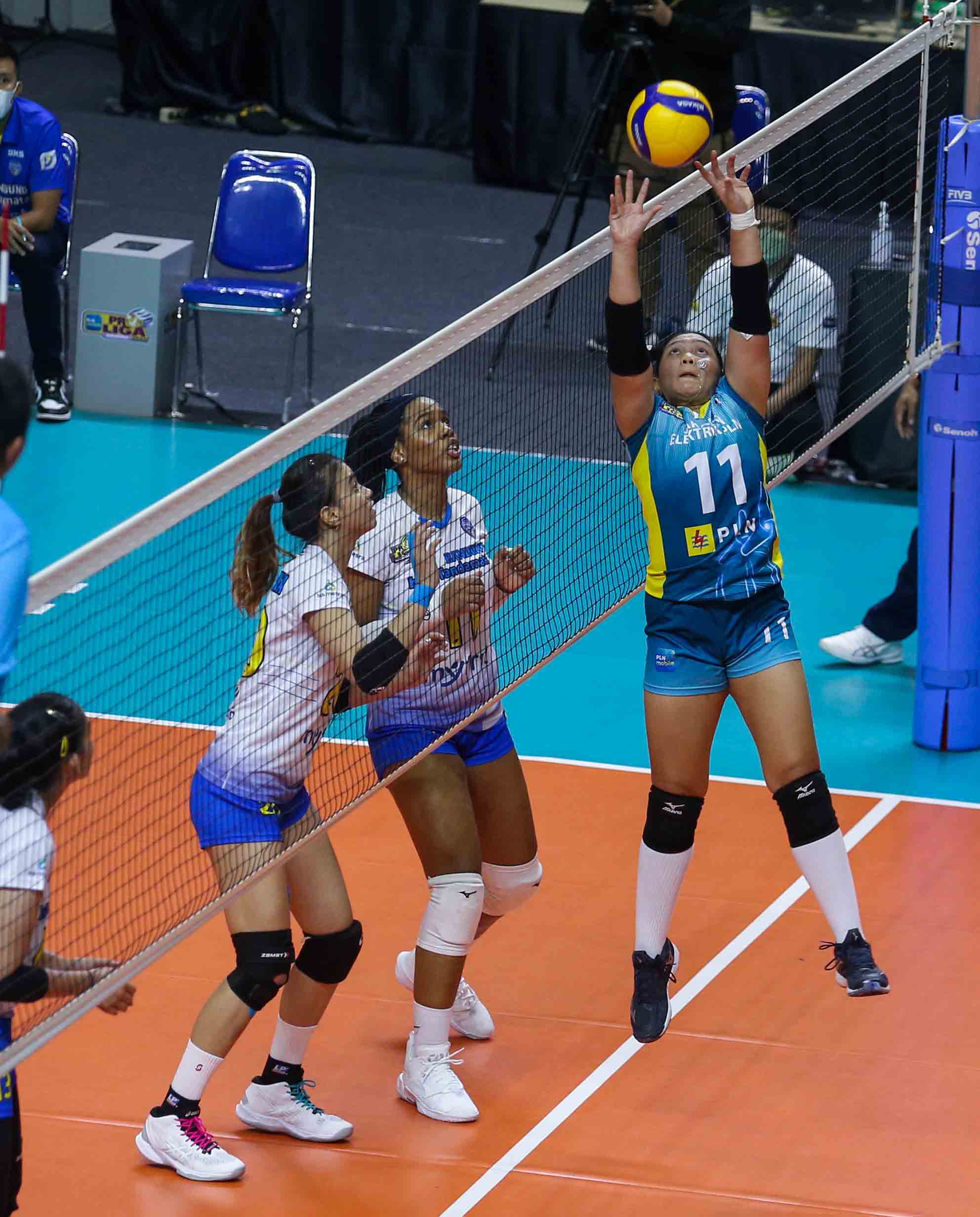 Tiara Ariance Ratna Sanger (11) pemain bola voli putri Jakarta Elektrik PLN memberikan umpan kepada rekannya. Jakarta Elektrik PLN kalah atas Bandung BJB Tandamata dengan skor 2-3. Pertandingan Proliga 2022 putaran pertama yang berlangsung di GOR Padepokan Voli Jenderal Polisi Kunarto, Sentul, Jum’at (18/2/2022). (Foto : Erly Bahtiar/Sportsmoment.id)
