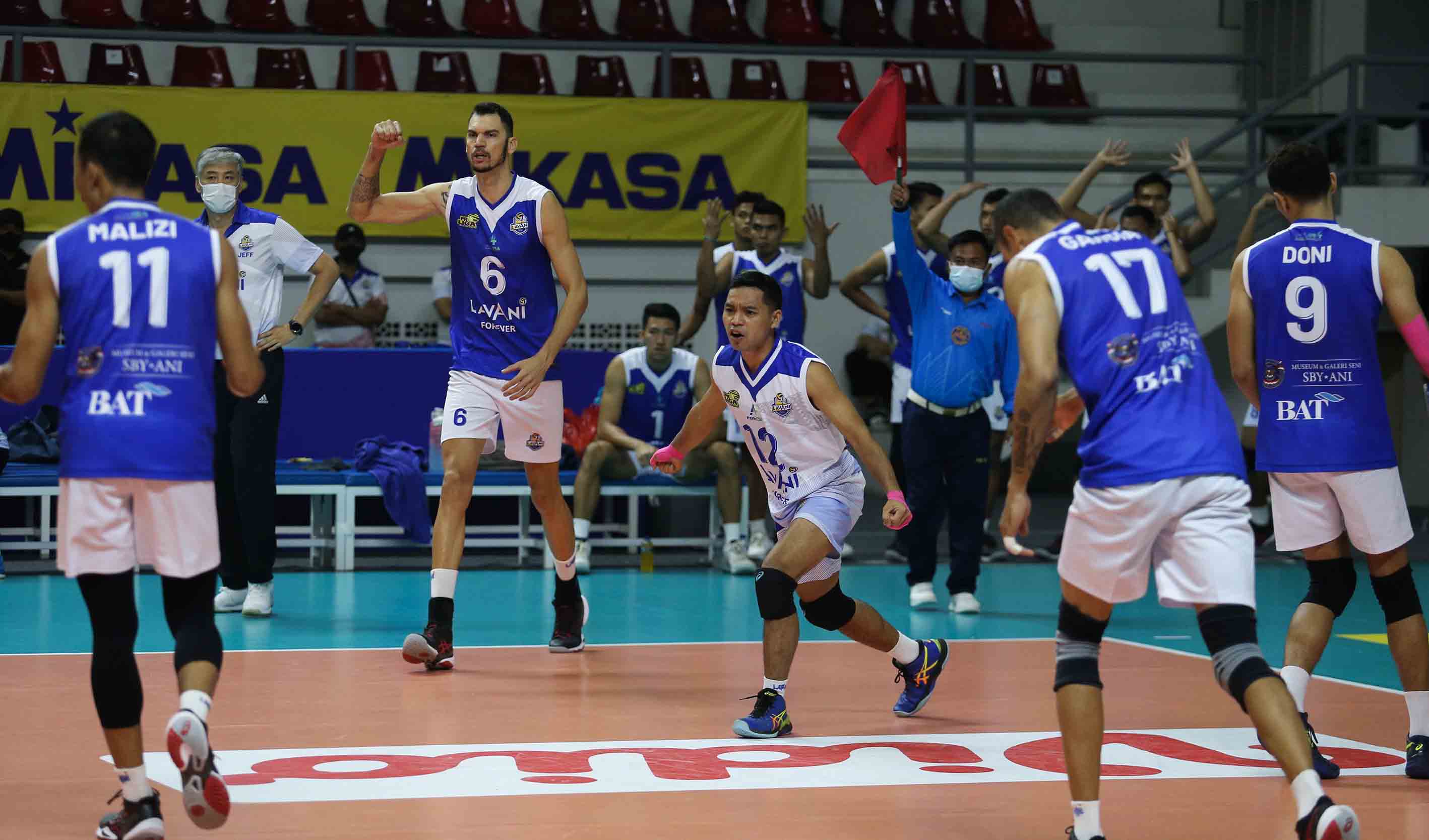 Irpan (12) pemain bola voli putra Bogor LavAni bersama rekan-rekannya meluapkan emosi kegembiraan setelah berhasil menyumbangkan poin. Bogor LavAni menang atas Surabaya Bhayangkara Samator dengan skor 3-1. Pertandingan Proliga 2022 putaran pertama yang berlangsung di GOR Padepokan Voli Jenderal Polisi Kunarto, Sentul, Jum’at (18/2/2022). (Foto : Erly Bahtiar/Sportsmoment.id)
