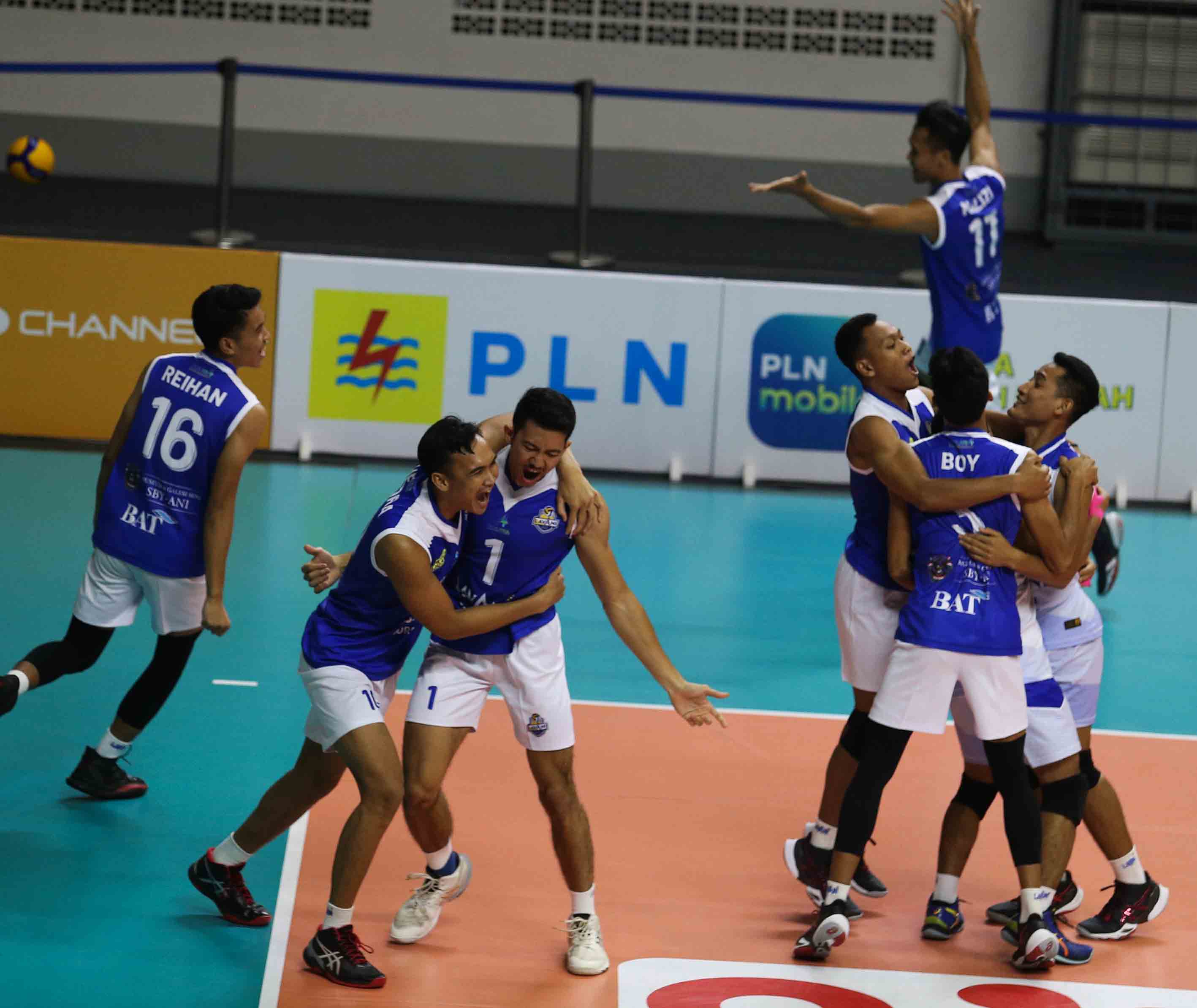 Para pemain bola voli putra Bogor LavAni meluapkan emosi kegembiraan setelah berhasil mengalahkan Surabaya Bhayangkara Samator. Bogor LavAni menang atas Surabaya Bhayangkara Samator dengan skor 3-1. Pertandingan Proliga 2022 putaran pertama yang berlangsung di GOR Padepokan Voli Jenderal Polisi Kunarto, Sentul, Jum’at (18/2/2022). (Foto : Erly Bahtiar/Sportsmoment.id)