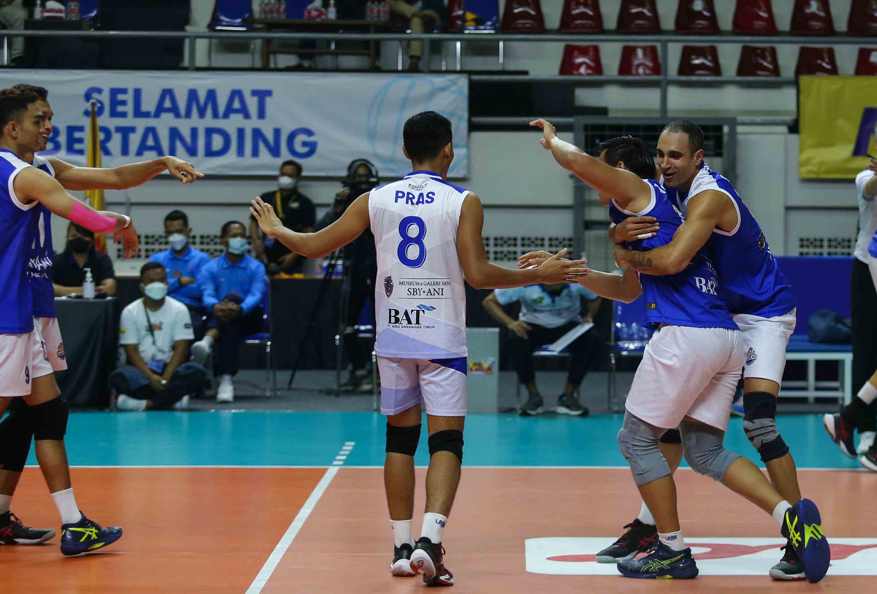 Para pemain bola voli putra Bogor LavAni meluapkan emosi kegembiraan setelah berhasil mendapatkan poin. Bogor LavAni menang atas Surabaya Bhayangkara Samator dengan skor 3-1. Pertandingan Proliga 2022 putaran pertama yang berlangsung di GOR Padepokan Voli Jenderal Polisi Kunarto, Sentul, Jum’at (18/2/2022). (Foto : Erly Bahtiar/Sportsmoment.id)
