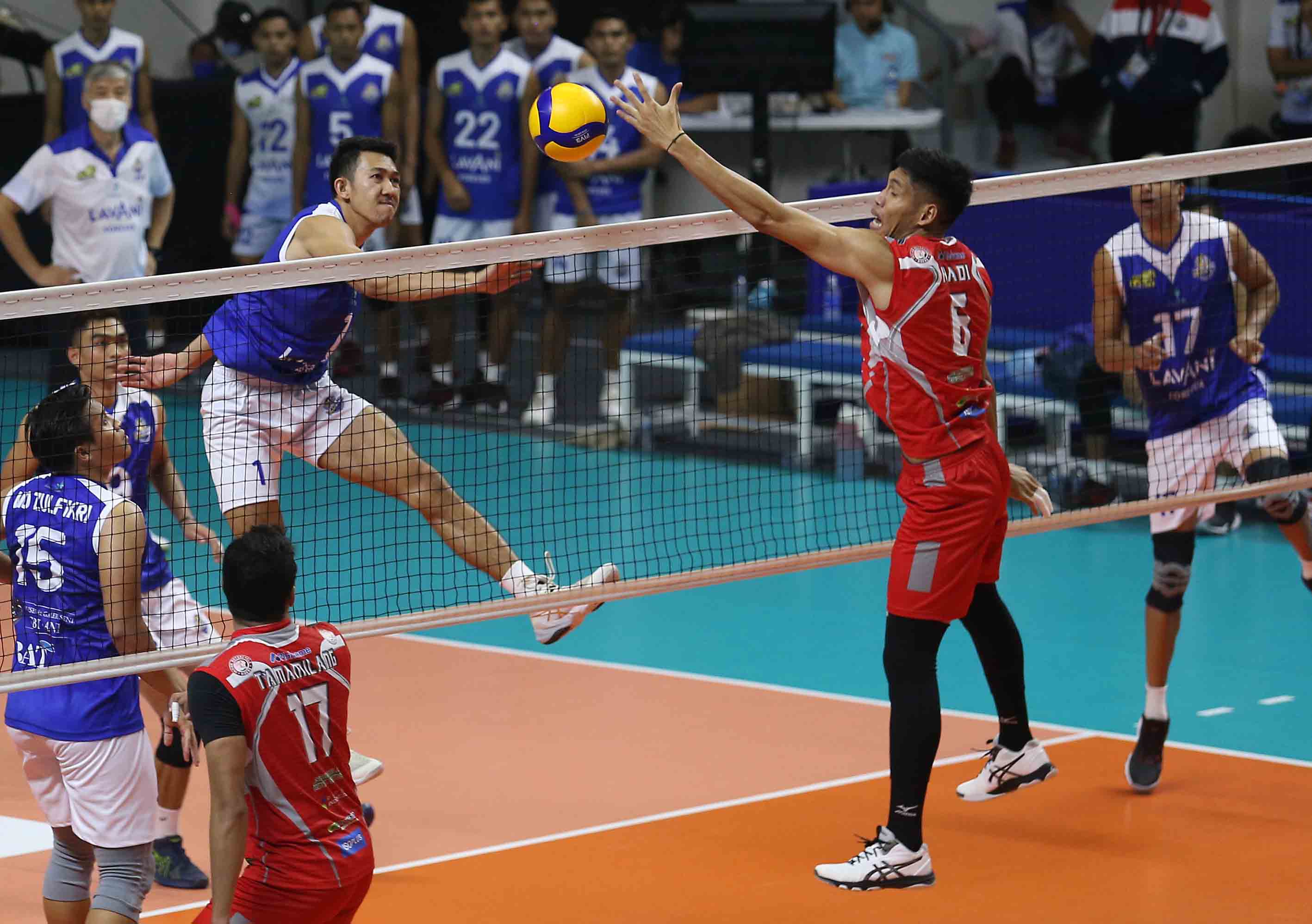 Daffa Naufal Mauluddani (1) pemain bola voli putra Bogor LavAni mengarahkan pukulan ke arah lawan. Bogor LavAni menang atas Surabaya Bhayangkara Samator dengan skor 3-1. Pertandingan Proliga 2022 putaran pertama yang berlangsung di GOR Padepokan Voli Jenderal Polisi Kunarto, Sentul, Jum’at (18/2/2022). (Foto : Erly Bahtiar/Sportsmoment.id)