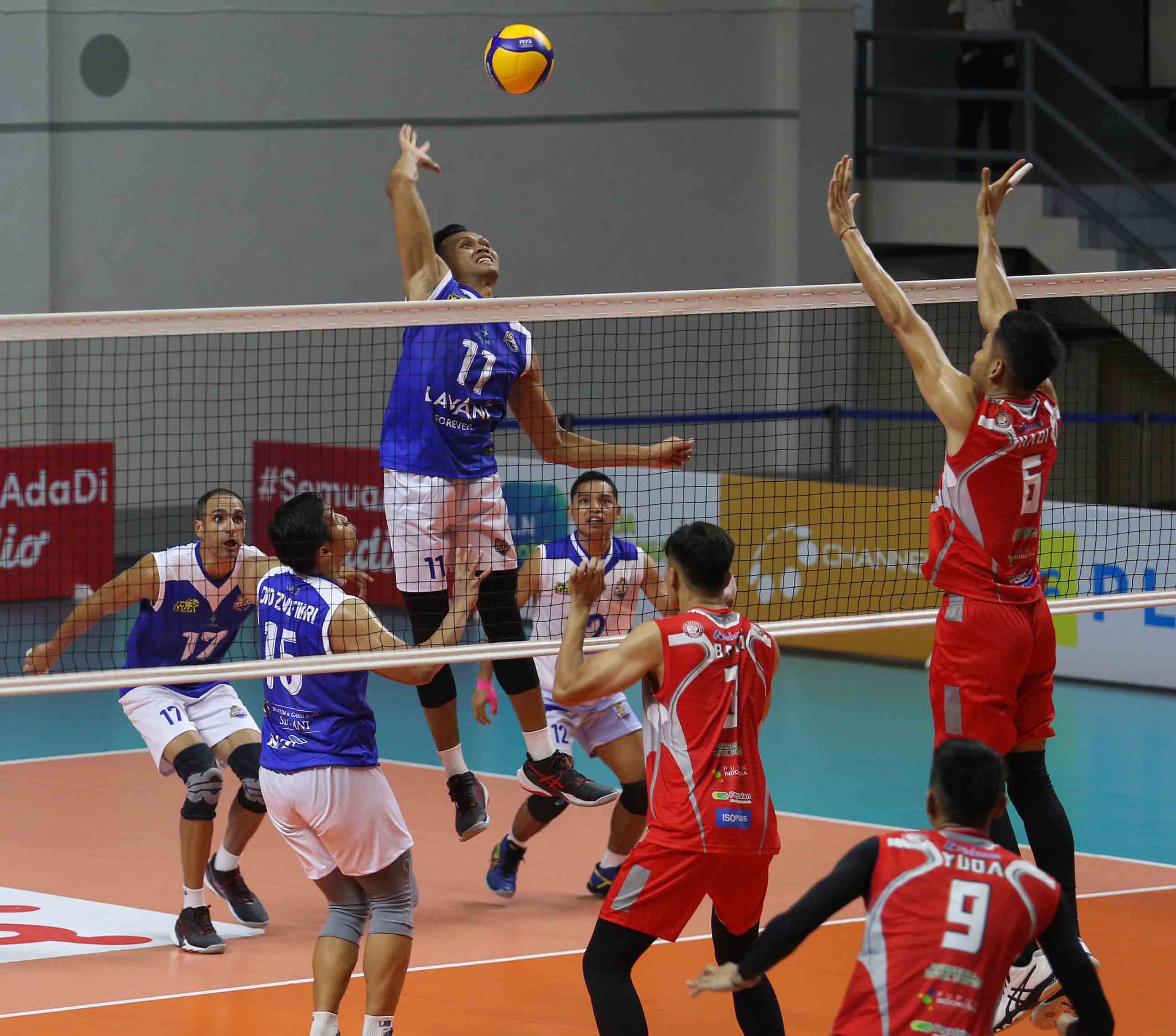 M. Malizi (11) pemain bola voli putra Bogor LavAni mengarahkan pukulan smashnya ke arah lawan. Bogor LavAni menang atas Surabaya Bhayangkara Samator dengan skor 3-1. Pertandingan Proliga 2022 putaran pertama yang berlangsung di GOR Padepokan Voli Jenderal Polisi Kunarto, Sentul, Jum’at (18/2/2022). (Foto : Erly Bahtiar/Sportsmoment.id)