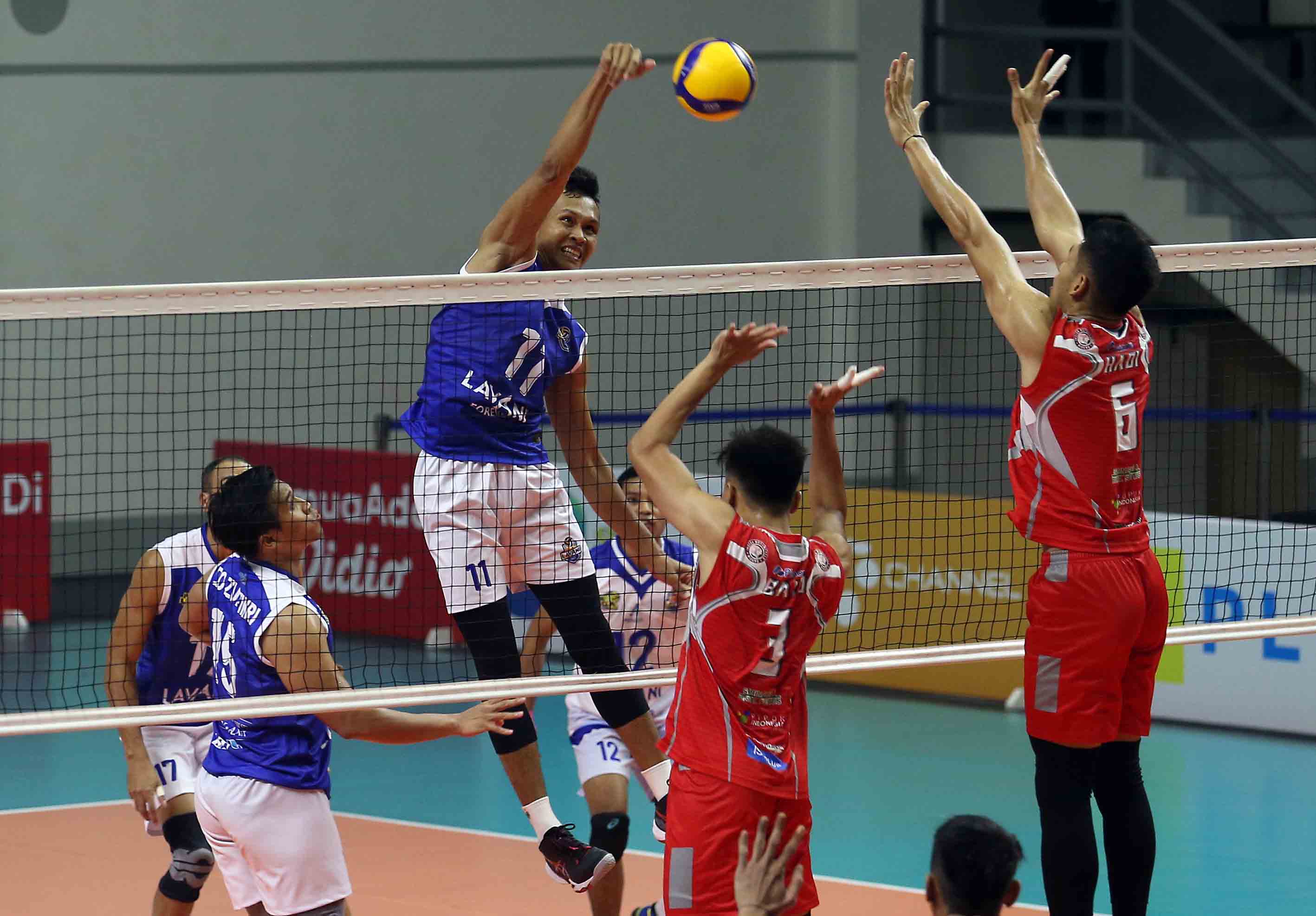 M. Malizi (11) pemain bola voli putra Bogor LavAni mengarahkan pukulan smashnya ke arah lawan. Bogor LavAni menang atas Surabaya Bhayangkara Samator dengan skor 3-1. Pertandingan Proliga 2022 putaran pertama yang berlangsung di GOR Padepokan Voli Jenderal Polisi Kunarto, Sentul, Jum’at (18/2/2022). (Foto : Erly Bahtiar/Sportsmoment.id)