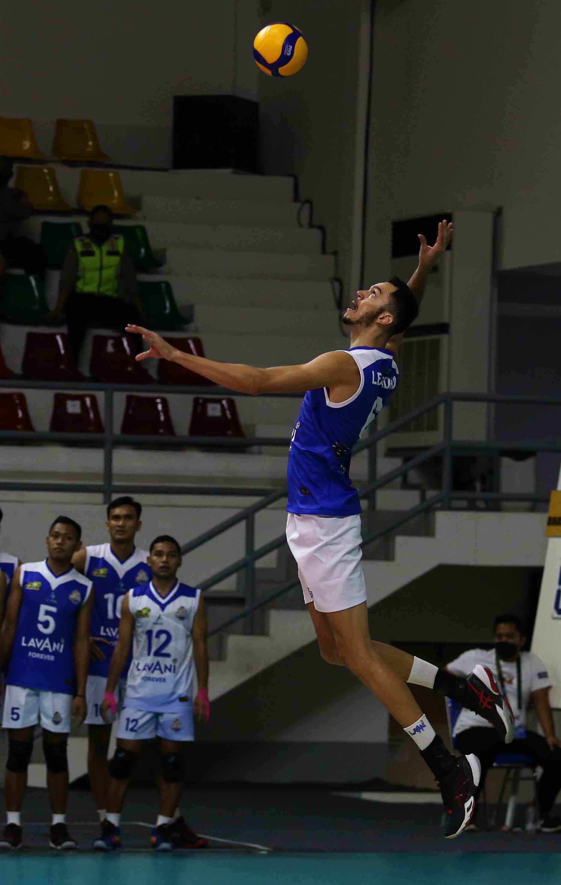 Leandro Martinus Da Silva (6) pemain bola voli putra Bogor LavAni melakukan servis ke area lawan. Bogor LavAni menang atas Surabaya Bhayangkara Samator dengan skor 3-1. Pertandingan Proliga 2022 putaran pertama yang berlangsung di GOR Padepokan Voli Jenderal Polisi Kunarto, Sentul, Jum’at (18/2/2022). (Foto : Erly Bahtiar/Sportsmoment.id)