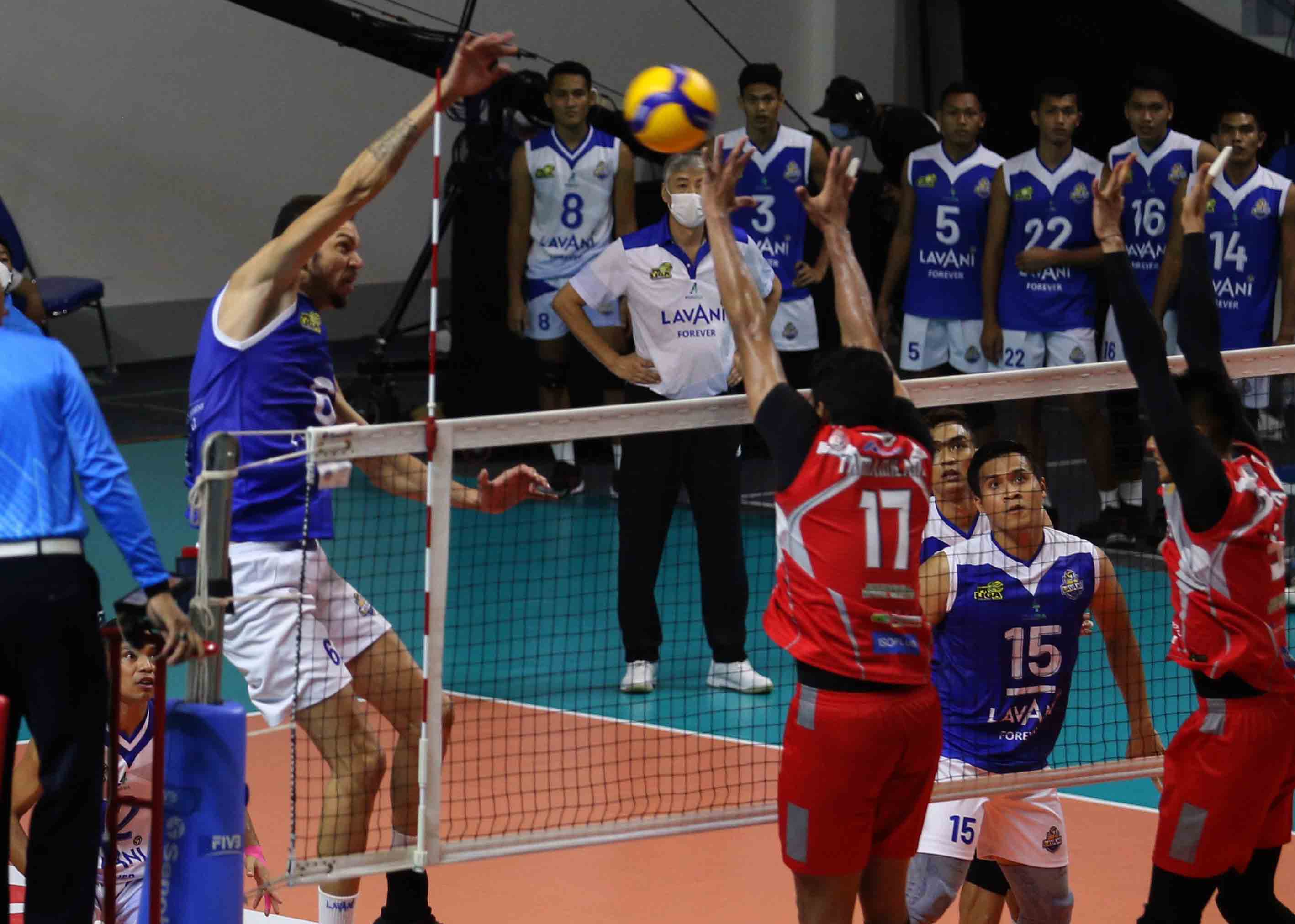 Leandro Martinus Da Silva (6) pemain bola voli putra Bogor LavAni mengarahkan pukulan smashnya ke arah lawan. Bogor LavAni menang atas Surabaya Bhayangkara Samator dengan skor 3-1. Pertandingan Proliga 2022 putaran pertama yang berlangsung di GOR Padepokan Voli Jenderal Polisi Kunarto, Sentul, Jum’at (18/2/2022). (Foto : Erly Bahtiar/Sportsmoment.id)