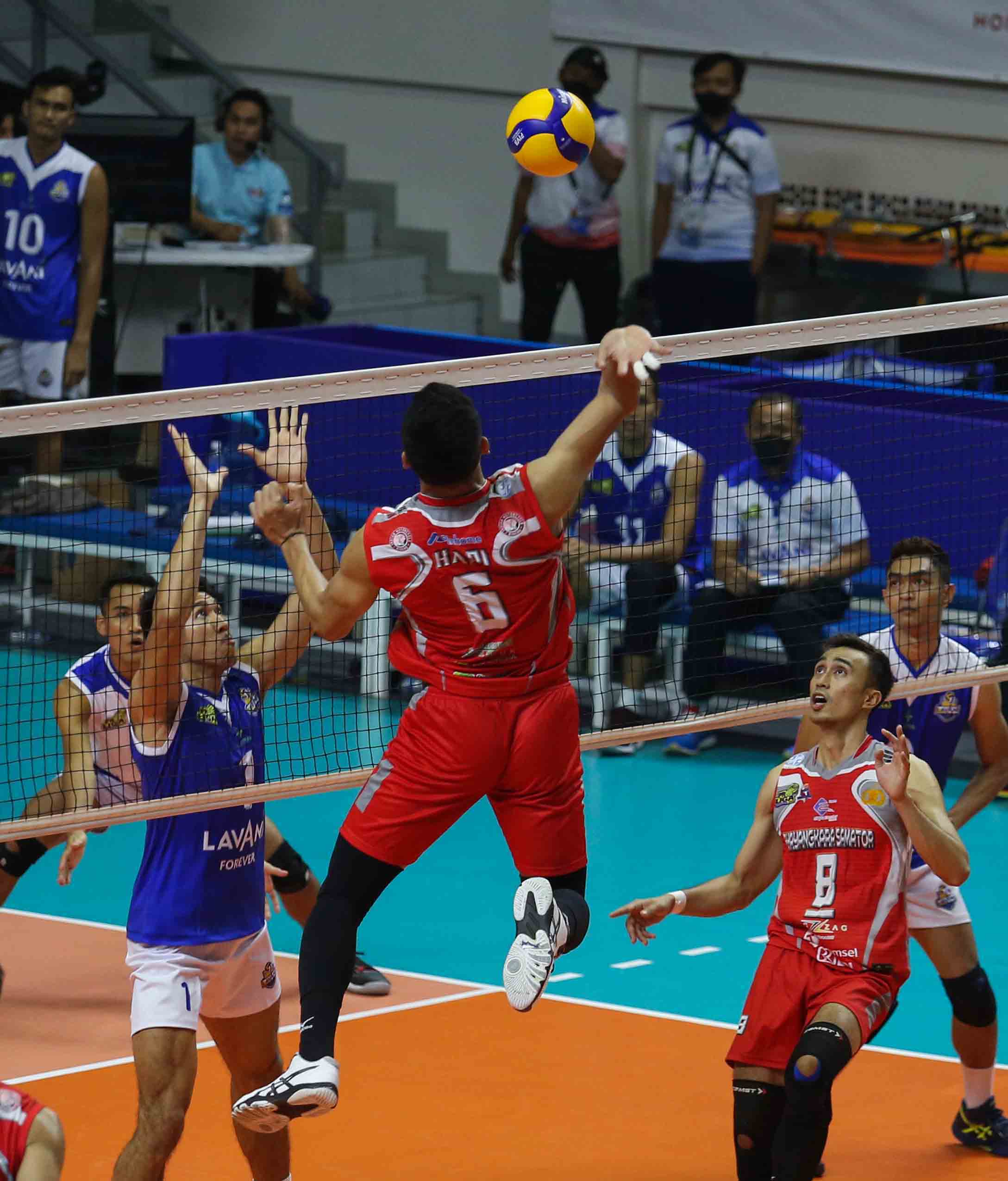 Hadi Suharto (6) pemain bola voli putra Surabaya Bhayangkara Samator mengarahkan pukulan smashnya ke area lawan. Surabaya Bhayangkara Samator kalah dari Bogor LavAni dengan skor 1-3. Pertandingan Proliga 2022 putaran pertama yang berlangsung di GOR Padepokan Voli Jenderal Polisi Kunarto, Sentul, Jum’at (18/2/2022). (Foto : Erly Bahtiar/Sportsmoment.id)