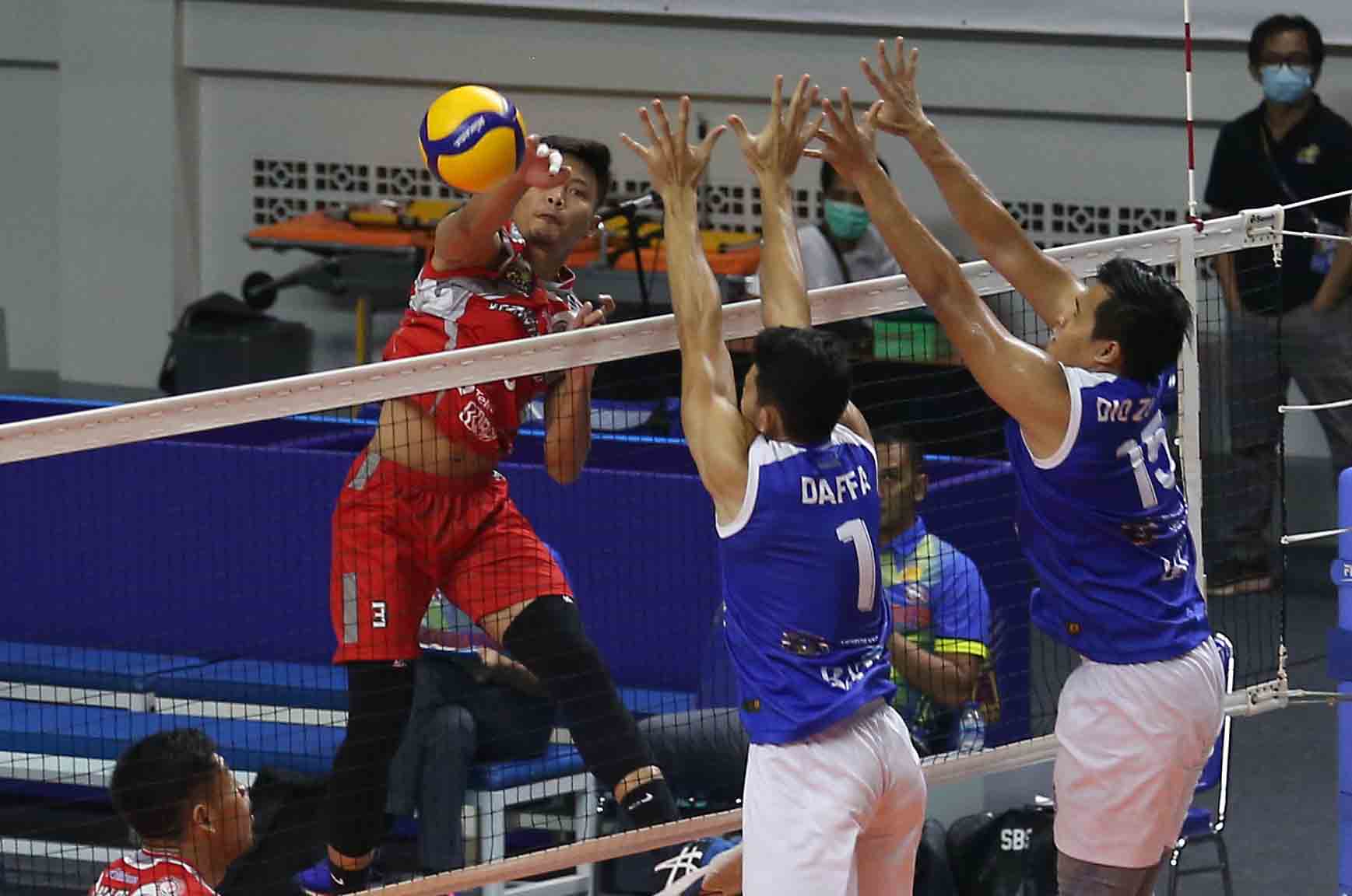 Galih Bayu Saputra (3) pemain bola voli Surabaya Bayangkara Samator mengarahkan pukulan smashnya ke area lawan. Surabaya Bayangkara Samator harus mengakui keunggulan dari tim bola voli putra Bogor Lavani dengan skor 1-3 (15-25, 26-28, 25-23, 25-27) pada Pertandingan Proliga 2022 putaran kedua yang berlangsung di GOR Padepokan Voli Jenderal Polisi Kunarto, Sentul, Jumat (18/2/2022). (Foto : Erly Bahtiar/Sportsmoment.id)
