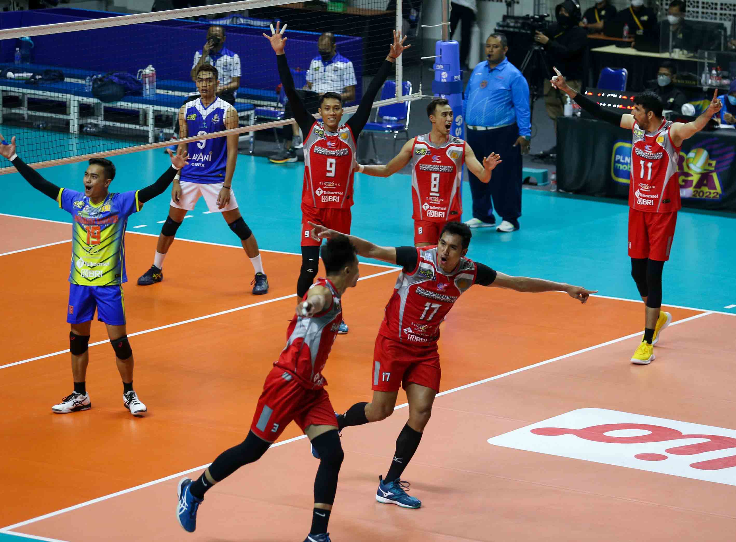 Rendy Febriant Tamamilang (17) pemain bola voli Surabaya Bayangkara Samator bersama rekan-rekannya meluapkan emosi kegembiraan setelah berhasil meraih poin. Surabaya Bayangkara Samator harus mengakui keunggulan dari tim bola voli putra Bogor Lavani dengan skor 1-3 (15-25, 26-28, 25-23, 25-27) pada Pertandingan Proliga 2022 putaran kedua yang berlangsung di GOR Padepokan Voli Jenderal Polisi Kunarto, Sentul, Jumat (18/2/2022). (Foto : Erly Bahtiar/Sportsmoment.id)