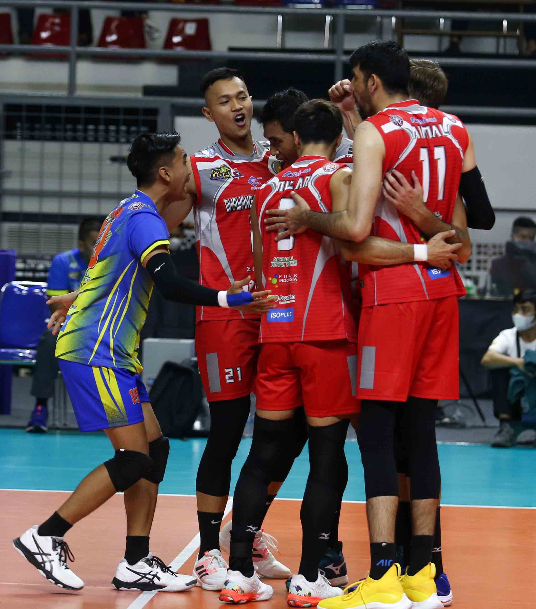 Pemain bola voli putra Surabaya Bayangkara Samator meluapkan emosi kegembiraan setelah berhasil meraih poin. Surabaya Bayangkara Samator harus mengakui keunggulan dari tim bola voli putra Bogor Lavani dengan skor 1-3 (15-25, 26-28, 25-23, 25-27) pada Pertandingan Proliga 2022 putaran kedua yang berlangsung di GOR Padepokan Voli Jenderal Polisi Kunarto, Sentul, Jumat (18/2/2022). (Foto : Erly Bahtiar/Sportsmoment.id)