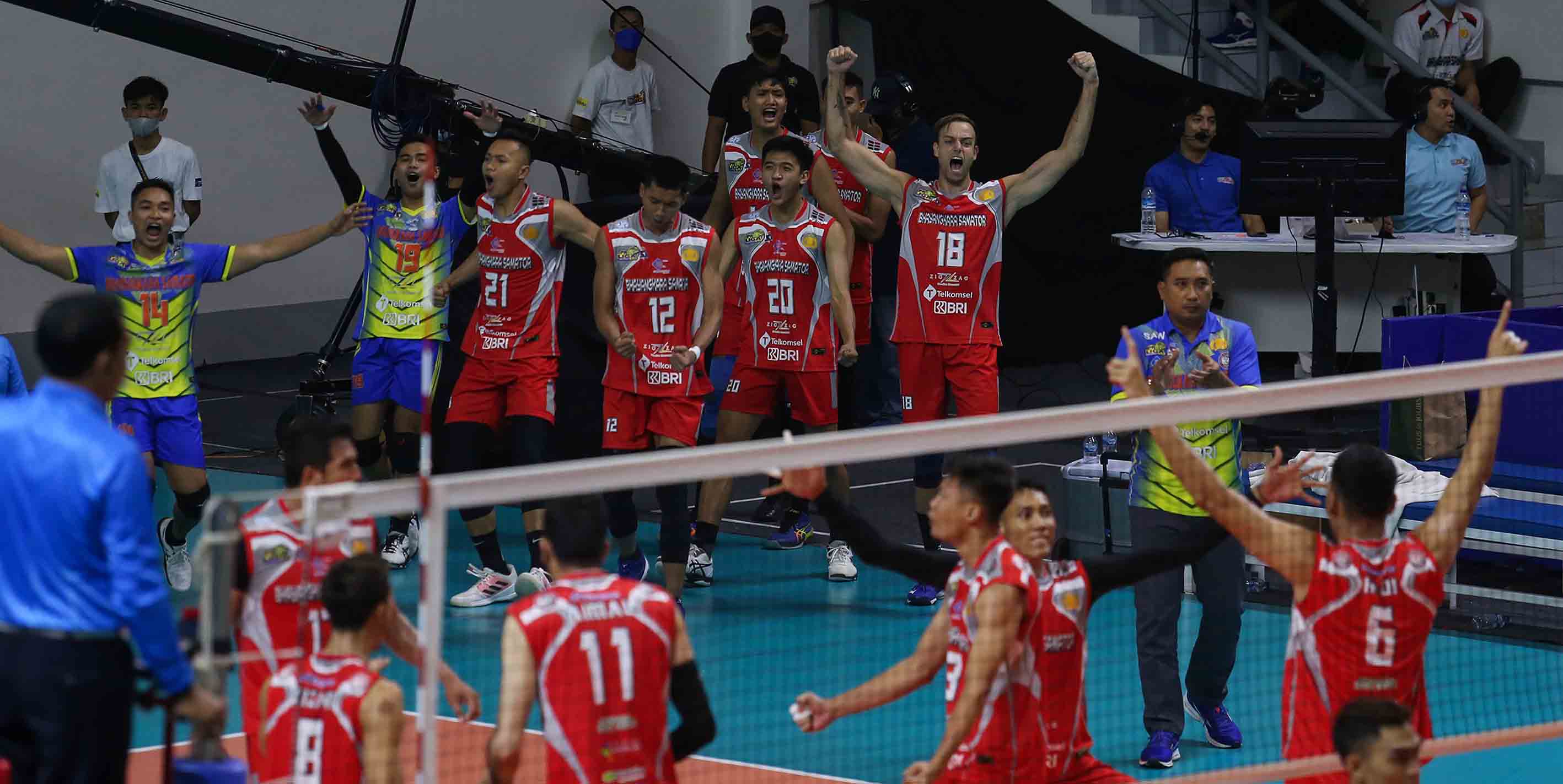 Pemain bola voli putra Surabaya Bayangkara Samator meluapkan emosi kegembiraan setelah berhasil meraih poin. Surabaya Bayangkara Samator harus mengakui keunggulan dari tim bola voli putra Bogor Lavani dengan skor 1-3 (15-25, 26-28, 25-23, 25-27) pada Pertandingan Proliga 2022 putaran kedua yang berlangsung di GOR Padepokan Voli Jenderal Polisi Kunarto, Sentul, Jumat (18/2/2022). (Foto : Erly Bahtiar/Sportsmoment.id)